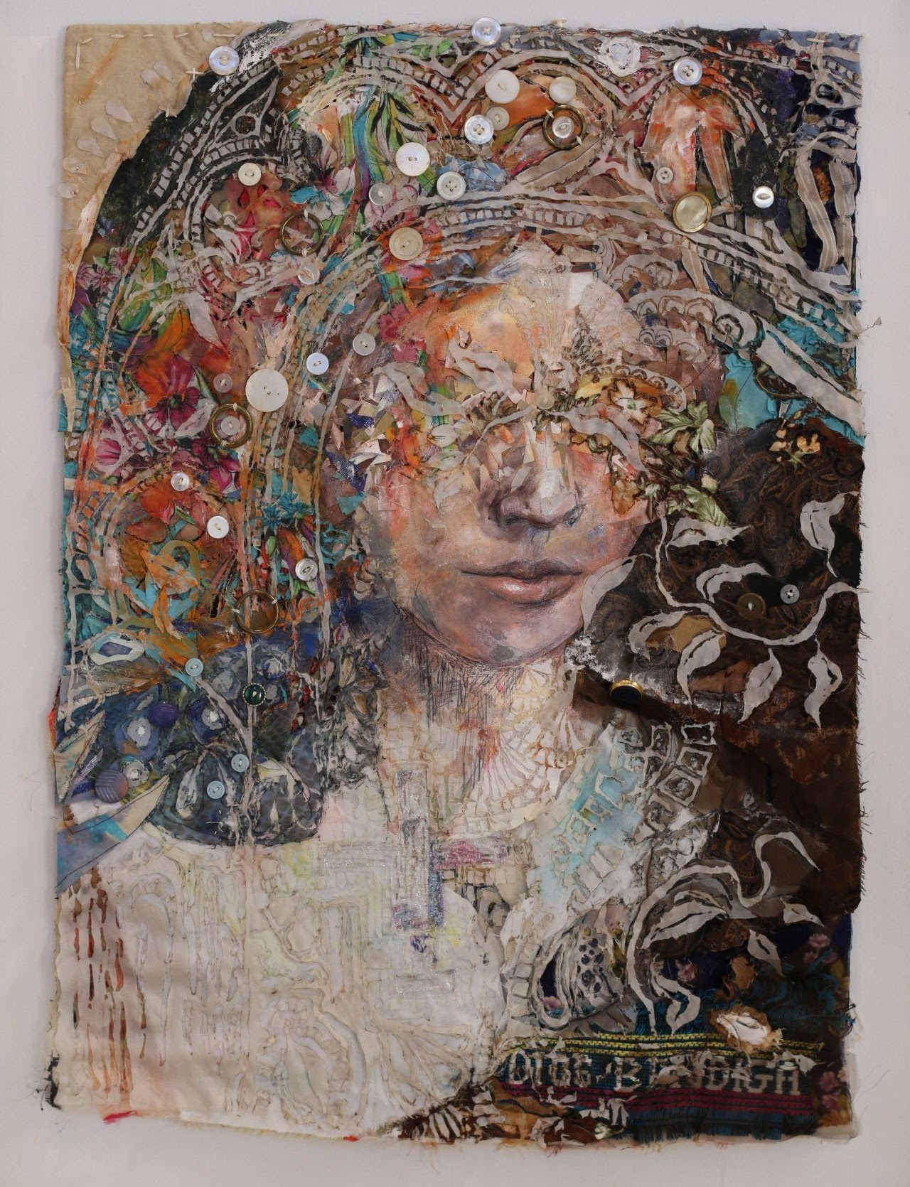 The works in my “Shadow Body” series, I use transparent fabrics with light reflective thread as a proxy for my mother’s spirit and a reminder of the permeable separation between the living and the dead. They also reflect my awareness of my aging body and the realization that I am now older than my mother was when she died at the age of 47. While there is a mourning aspect in these works, there is also a growing acceptance and celebration of my aging body.