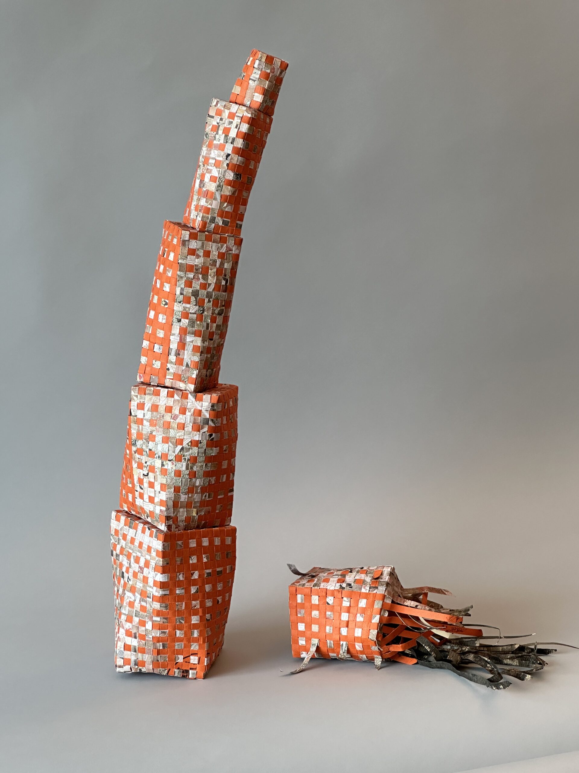 My Faulty Towers series uses recycled paper to comment on social ills and environmental issues. Artists must have a voice in these tumultuous times. Technique and material draw the viewer in, making the message poignant. “No Waste Fashion” is a piece with precarious stability. Our beloved fashion industry has long caused great damage to the environment and continues to abuse its workers, who are mostly women. Disposable fast fashion pushes our planet to a frightening tipping point. One twisted block has crashed open and “The Inside Story” spills out revealing the dirty little secrets of the fast fashion industry, exposing the true cost of wasteful and inhumane practices. By reusing the bags that held objects long-ago purchased from companies with sustainable and ethical business models, I create my own no-waste fashion that seeks to spark important conversations.