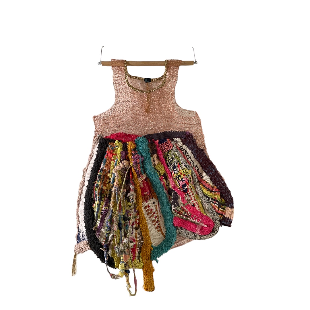 This piece was created in response my personal daily life,to getting up and getting my day I started but working for hours alone in my home studio. The balance of gratification of work and often the loneliness in life.It is knit, crochet and macrame. * Dressed with nowhere to go * Sitting alone In silence * Dreaming of love and romance * Feeling despair * Days creep by Years fly * Dressed with no one to see *