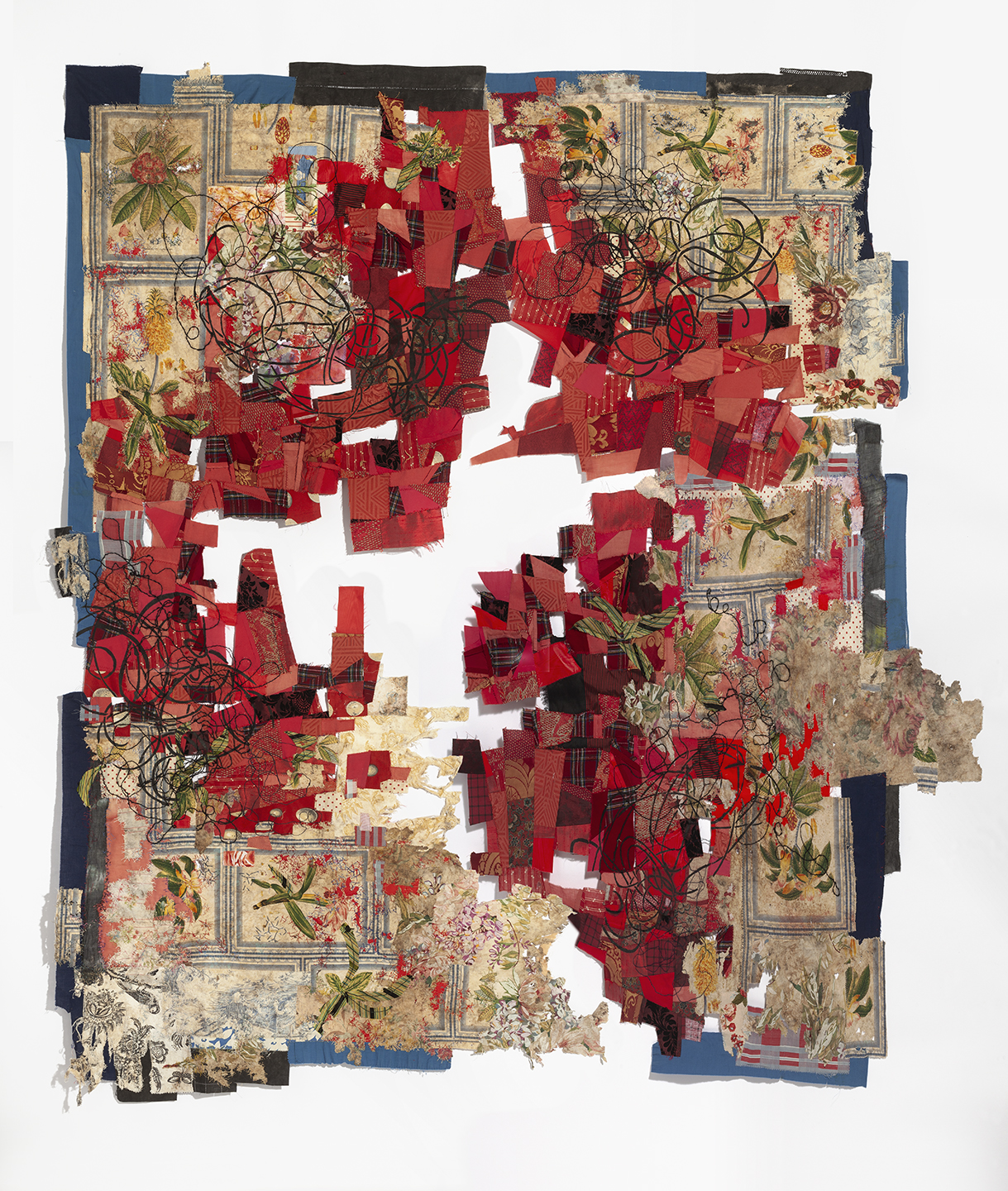 Cotton, silk noil, found domestic textiles, small objects [46" x 32"]