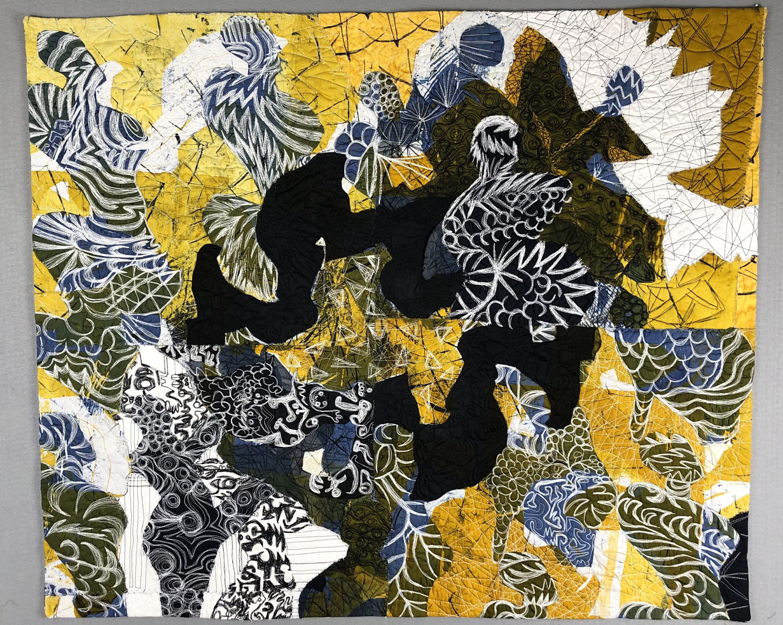 Cotton Fabric, silk screened with Procion MX dyes, cut up, re assembled, stitched back together, machine stitched and embroidered with cotton and rayon threadCotton Fabric, silk screened with Procion MX dyes, cut up, re assembled, stitched back together, machine stitched and embroidered with cotton and rayon thread [W 37" X H 31"]