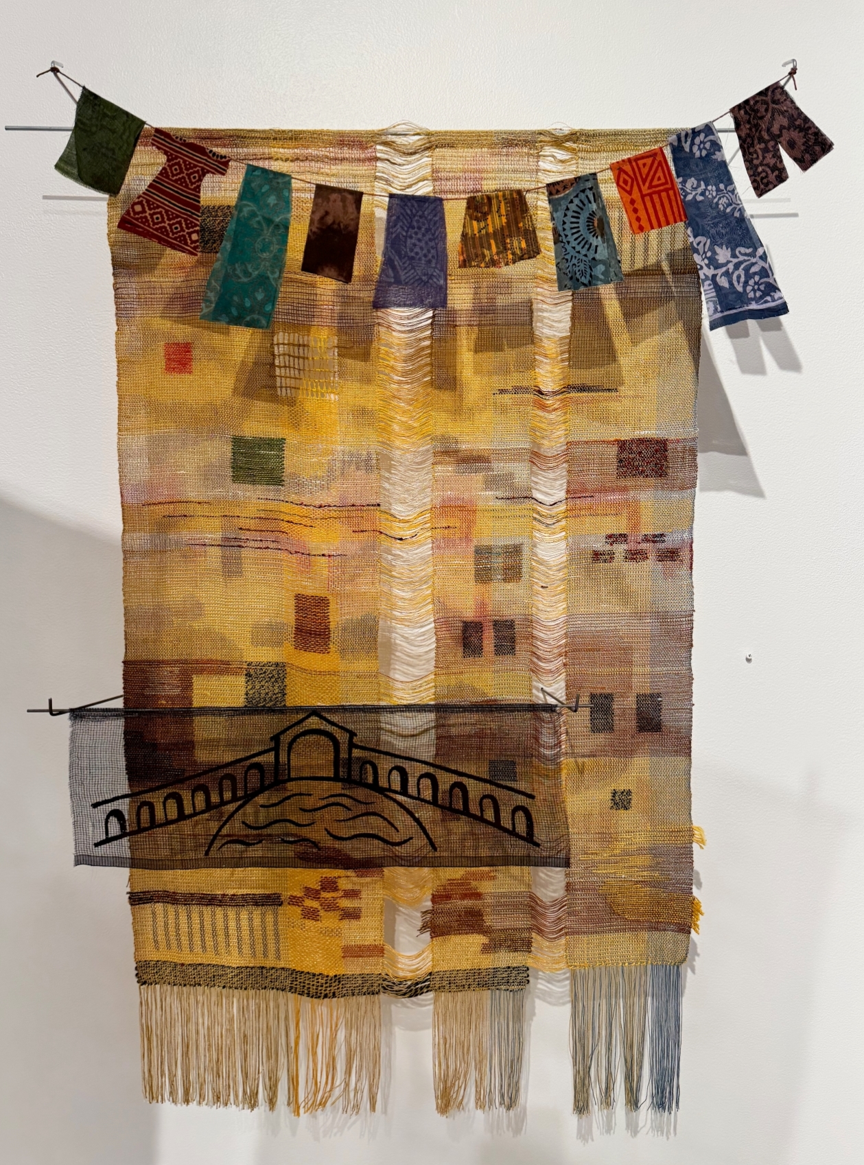 On the Island is from my series of using a simple clothesline as a metaphor, connecting women of the world over generations ".....the colors dazzling as they soak up the sun, and tie us with invisible knots of love like the voices of our grandmothers from a distant past......"