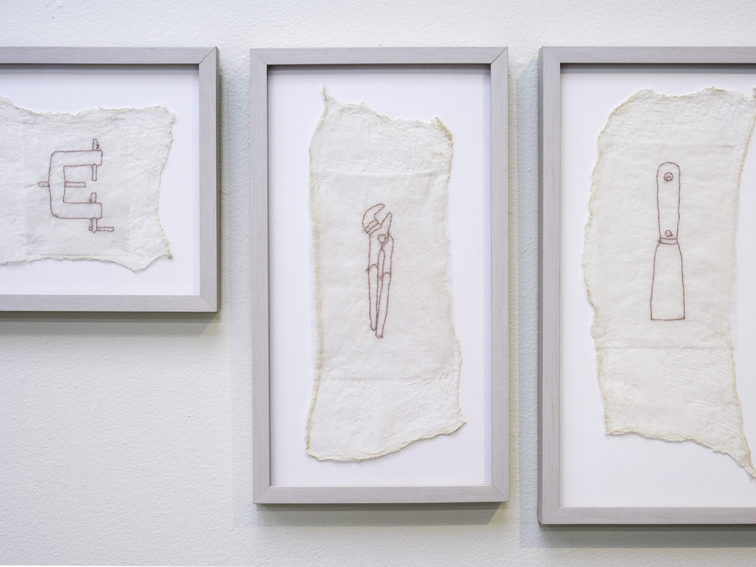 Hand-stitched diminutive outlines of artist’s father’s tools made from avocado-dyed cheesecloth, cotton thread, used dryer-sheets (includes needle-nose pliers, c-clamp, adjustable pliers, hammer, needle-nose pliers with wire cutter, wrench, Phillips screwdriver, putty knife) [various sizes]