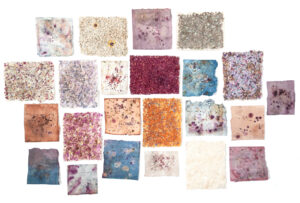 - Stephanie Singh (Sheridan College / Bachelor of Craft and Design, Textiles Major) NATURAL SURFACES COLLECTION. 2019/2020, Flax Papers: Tea, Marigolds, Blue Salvia, Roses, Peony, Lavender, Hosta’s & Pine Shavings. Eco-printed/Emersion dyed, Indigo, Cochineal, Black Walnut, Marigolds, Oak Leaves, Eucalyptus, Blue Salvia & Japanese Maple, 40″ x 40”.