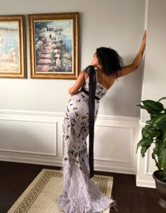 - Dominique McNeal (Kendall College of Art & Design / Fashion Studies) Earthenware Off The Shoulder Beaded Evening Gown, 2020, appliqué, beading, feathers, tulle, polyester stretch satin, 60″ high x 22″ wide (44″ circumference).