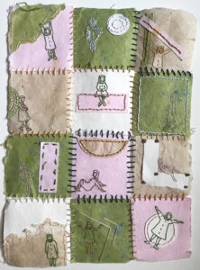 - Haley Lykins (University of Missouri / School of Visual Studies: Fibers) Patchwork Poses, 2019, Embroidery on handmade paper, 8.5″ x 12″