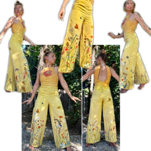 - Aureolus Stetzel (UC Davis / MFA in Design) Pollinator’s Jumpsuit, materials entirely sourced from within CA and completely biodegradable and climate beneficial: cotton twill dyed with turmeric, fibershed wool dyed with natural dyes, macraméd wool yarn.