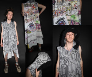 - Axel Steeno (UC DAVIS / Design: Fashion and Textiles) Apocalyptic Elegance, 2020, digitally printed cotton knit, spray paint, upcycled fake fur, one size