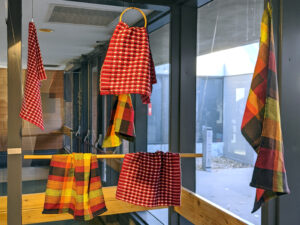 - Heather Matthews (Colorado State University / BFA: Fiber) Everyday Beauty. 2019. Handwoven Brassard Cotton, 3 red towels: each 21 x 15″, 3 plaid towels: each 28 x 17″