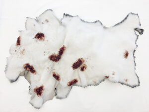 - Taylor Orr (Eastern Michigan University- School of Art & Design / Fibers ) Sheepskin, 2019, sheepskin & beads, 24″ x 18″ x 4″