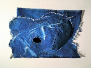 - Tina Marks (University of North Texas / MFA Studio Art: Fibers) Whispers, 2019, Cyanotype cotton with hand embroidery and traditional hand tailoring, 17″ x 11″