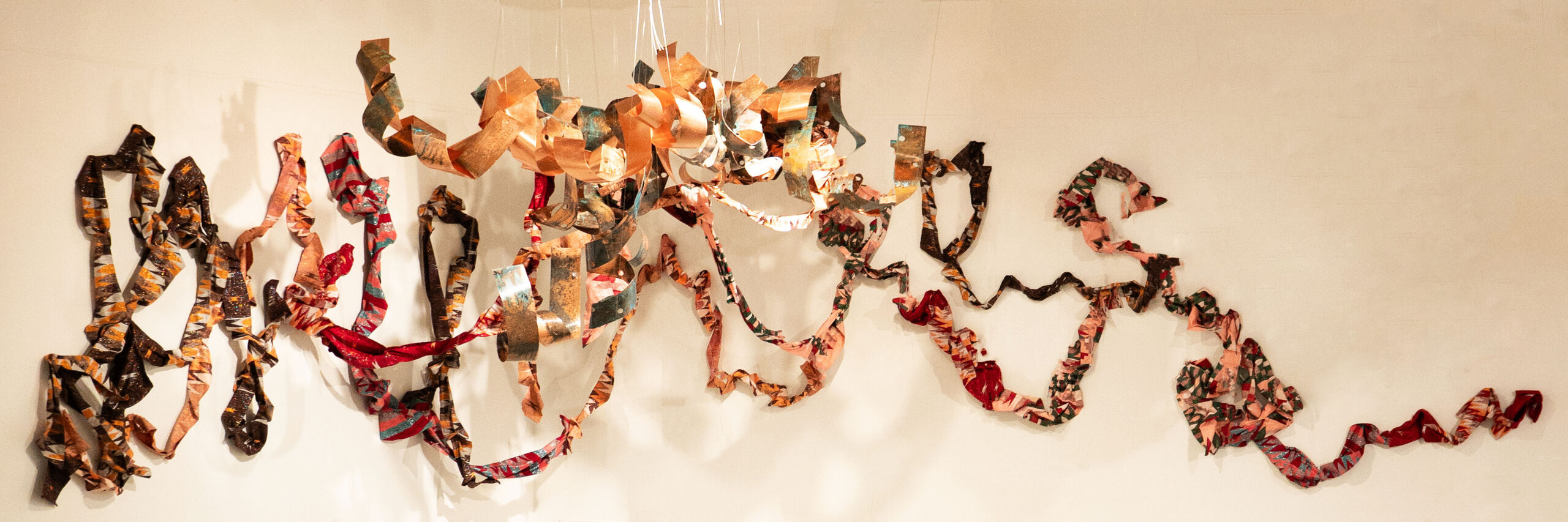 Handwoven Kente, Patinated copper, Embroidery floss [180" x 245" x 36.8"]