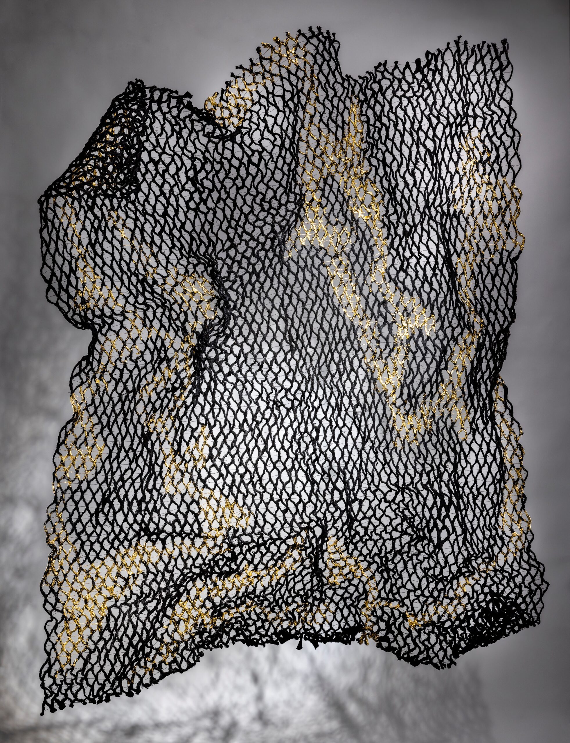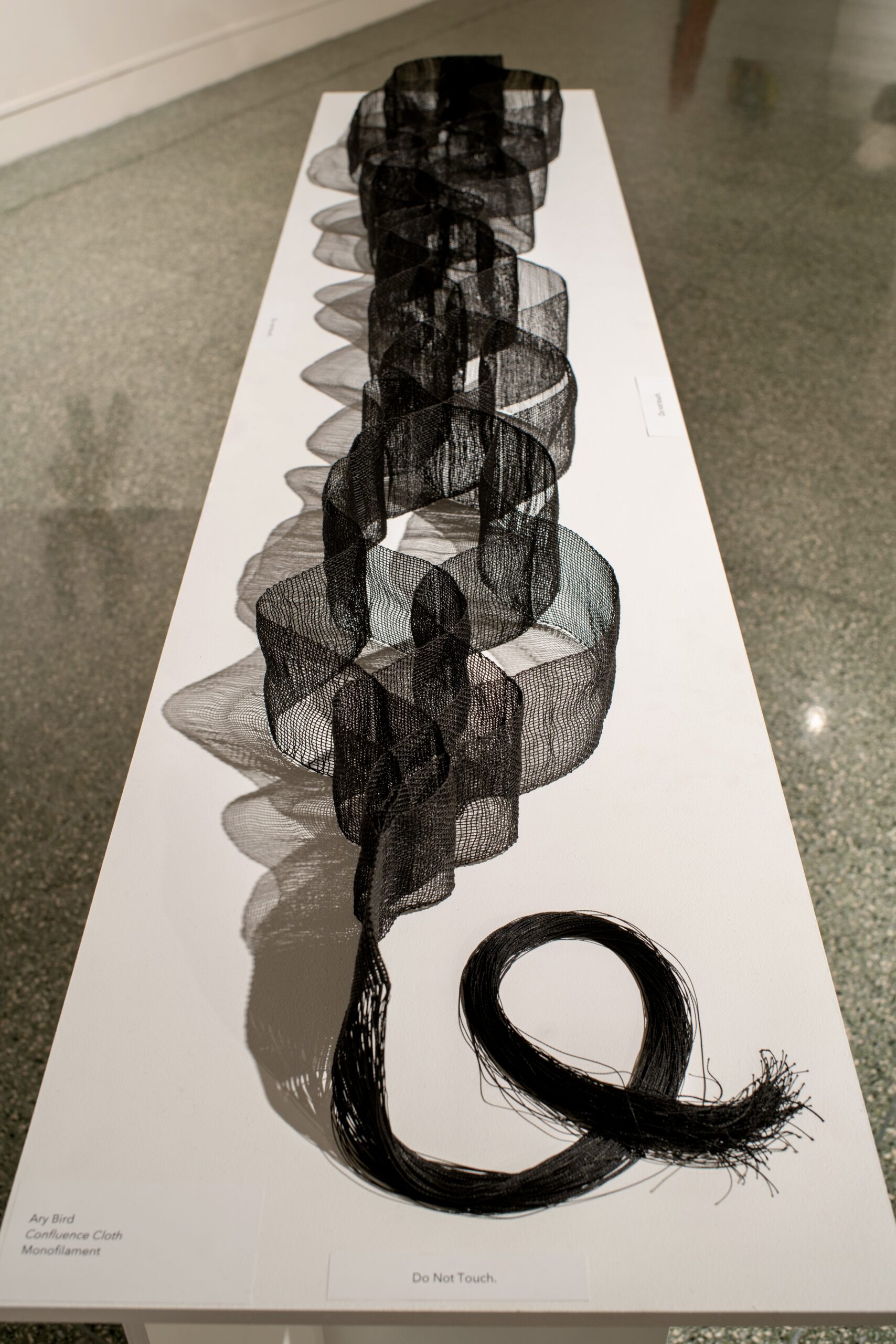 Confluence Cloth is a physical manifestation of Ary's love of the loom and it's vast capabilities. Four layers of cloth are woven simultaneously with multiple intersections where each layer crosses through others. It's made of monofilament and displayed on it's side, casting dimensional shadows. Photo by Ary Bird.