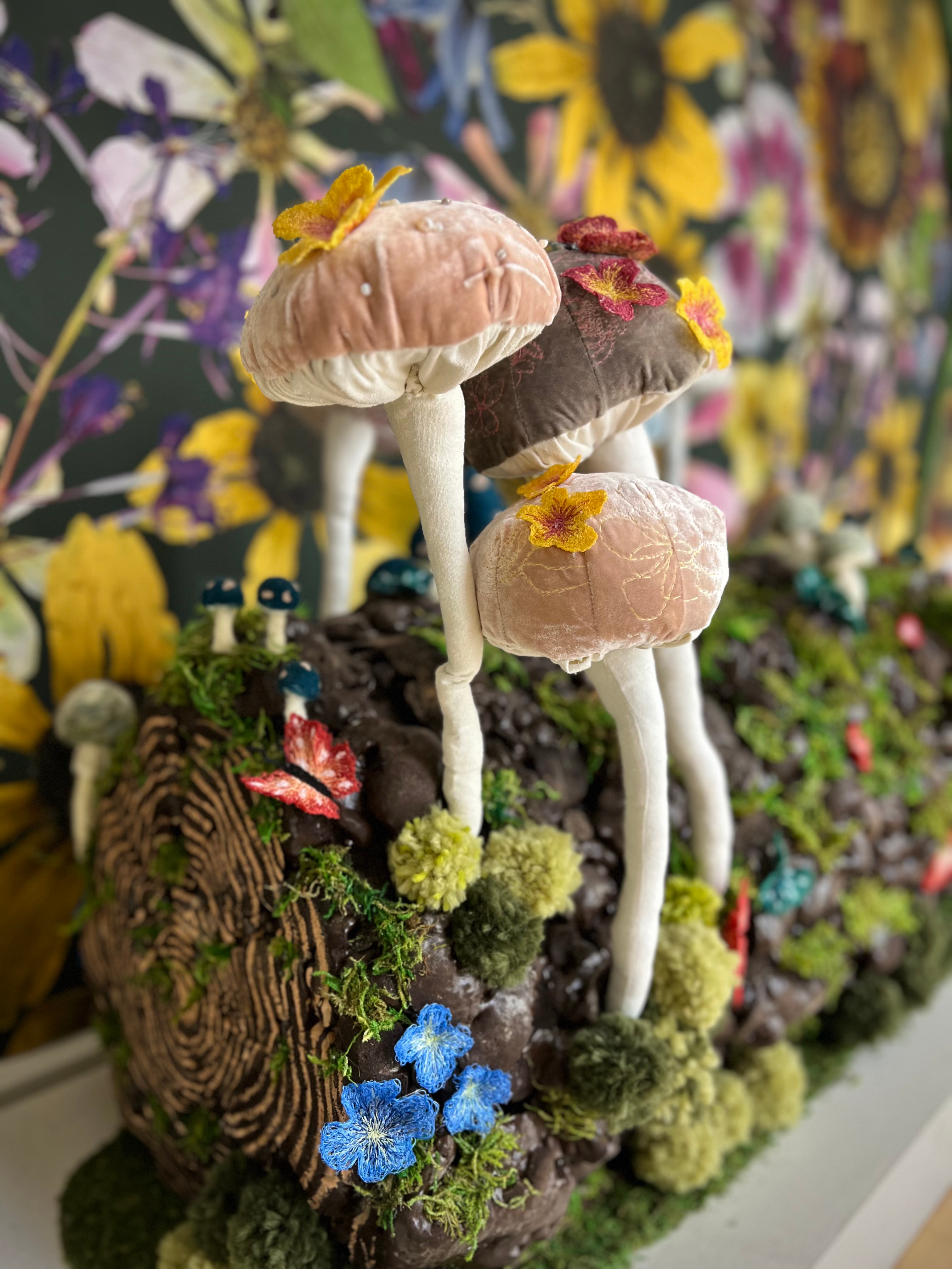 This sculpted log form is embellished with sewn mushrooms, embroidered flowers and butterflies, needle felted mushrooms, and hand-made pom poms. Meant to bring a bit of peace and whim to the world, it was a labor of love to create and a joy to experience. Photo by Sarah Clark.