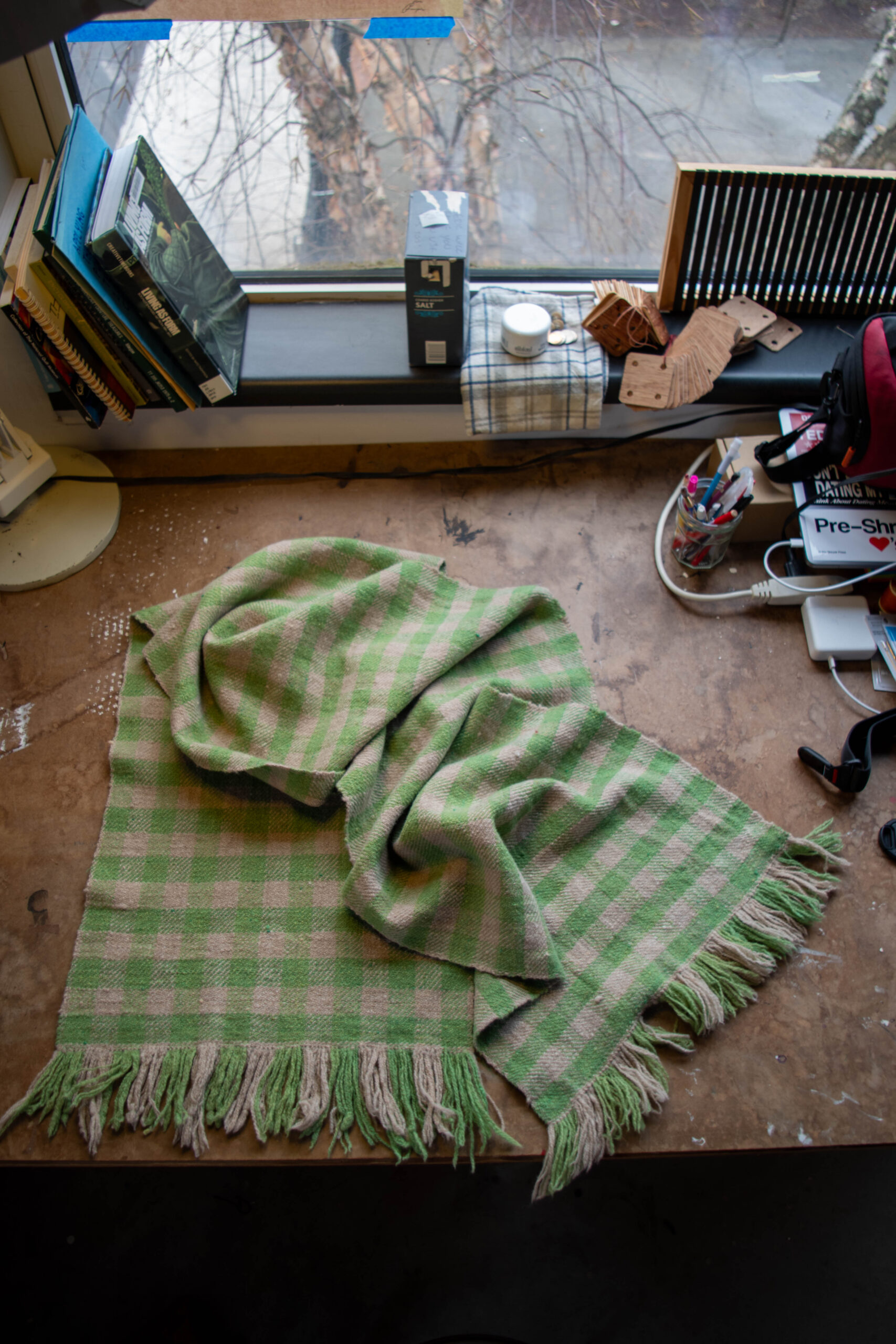 An experiment in the memory-holding capabilities of cloth, this scarf was handwoven from wool processed entirely by hand by the artist. The wool was sourced from a local sheep named Possum, and this cloth is for him. Thank you Possum for keeping me warm.
