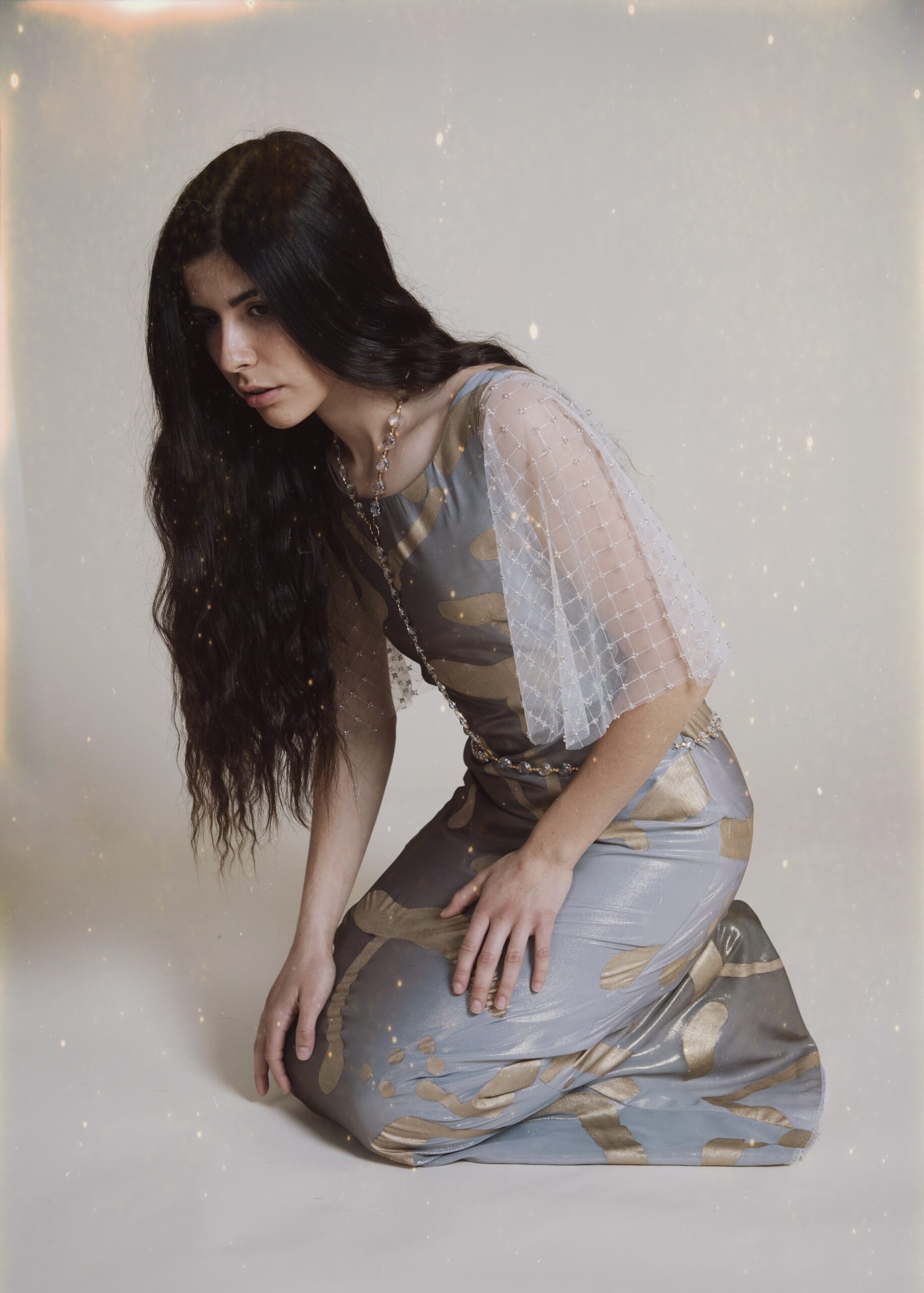 This dress draws inspiration from the timeless Hebrew scriptures of the Bible. Delicately hand-painted onto the fabric, the sacred text envelops the wearer, symbolizing an embrace by the divine word and how it is living and active around us.