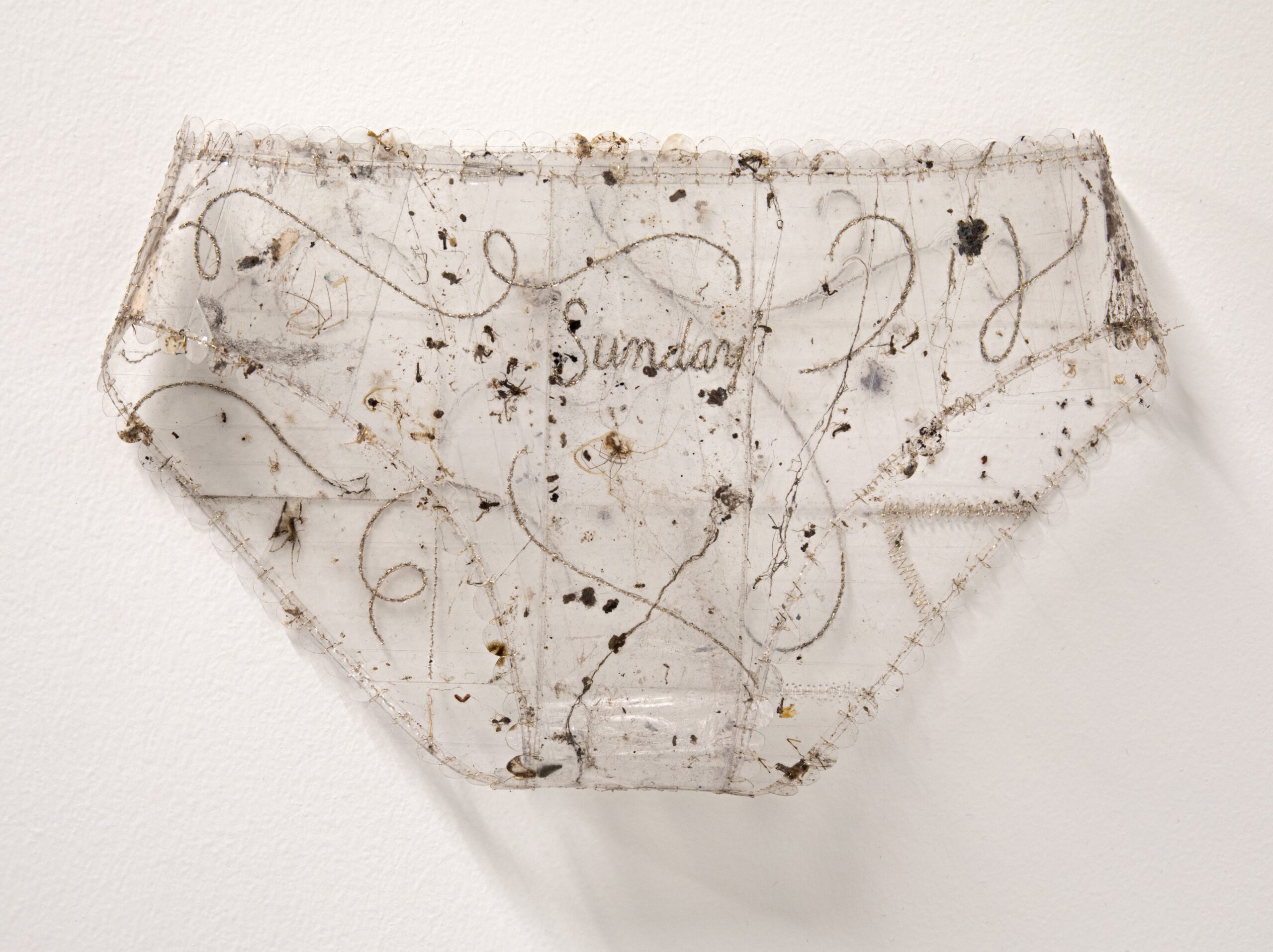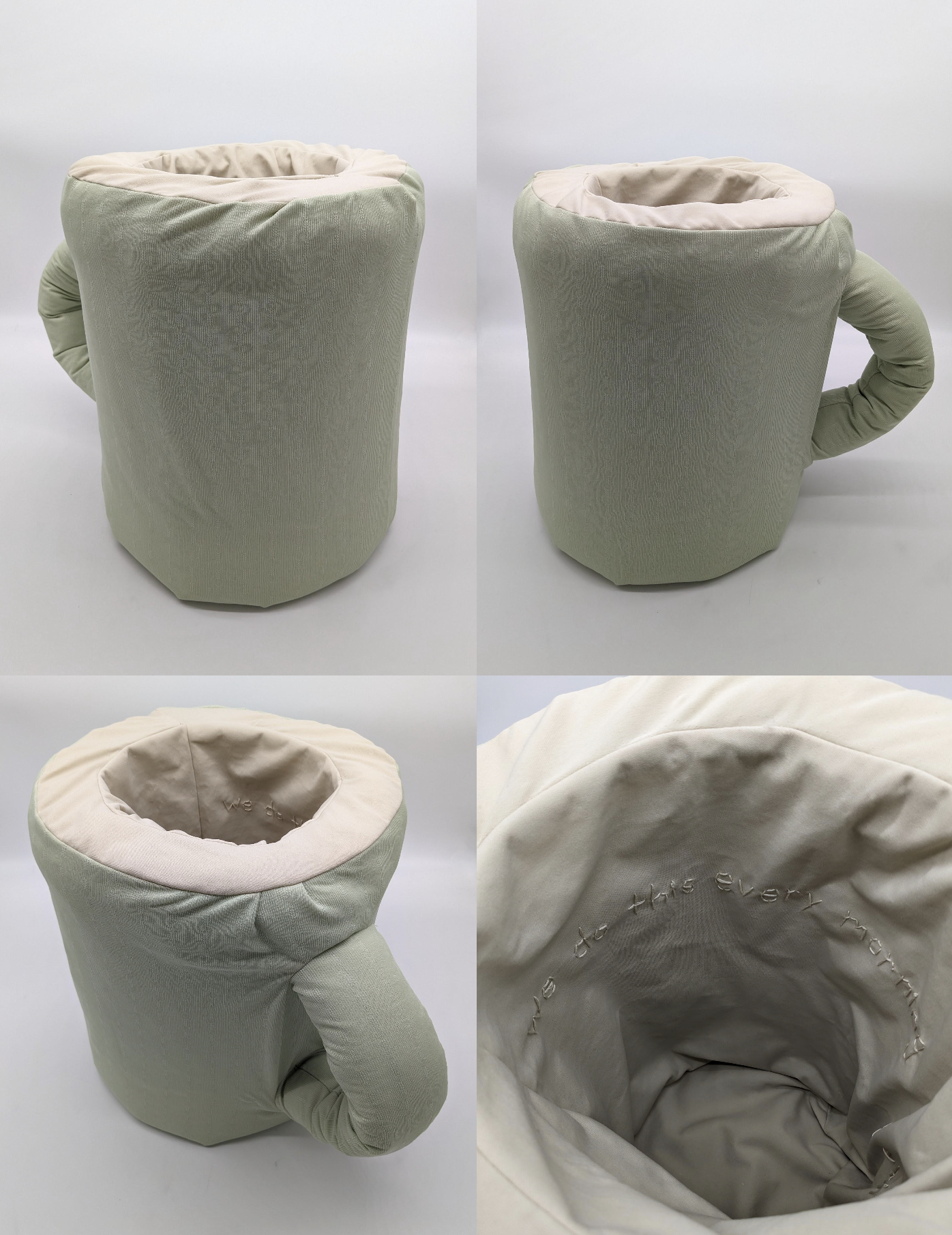 This soft sculpture occupies a space in between silliness and seriousness with its large appearance contrasting the delicate embroidered words inside. With this sculpture I pay homage to my childhood views of the common objects around the home I grew up in.