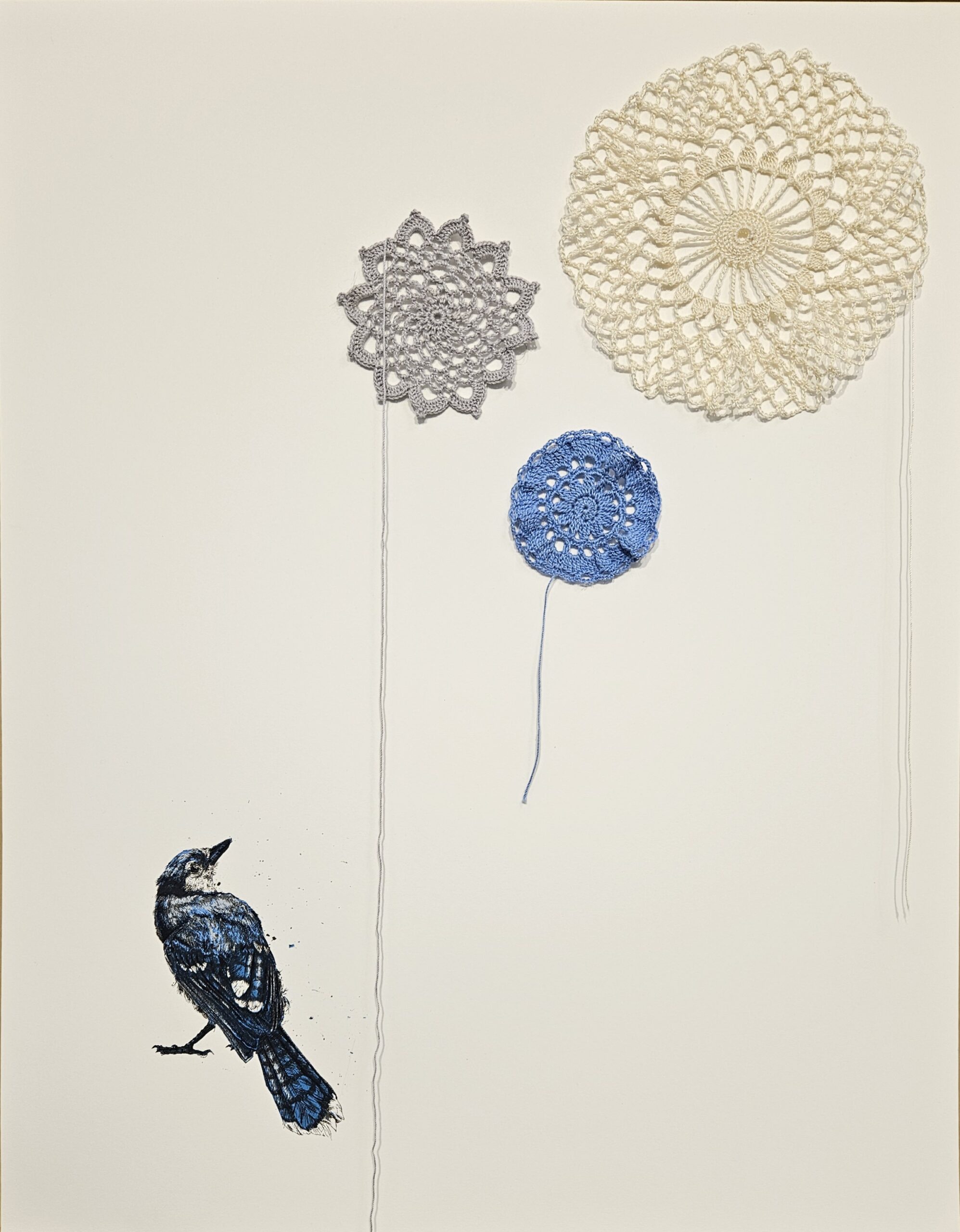 My work focuses on the idea of memory. Crochet is a comfortable and familiar place for me and I utilize it to represent memory. I leave my working end hanging, allowing for the opportunity to either continue on and expand the doily, or pull and unravel it. Like a memory, it can grow or be forgotten.