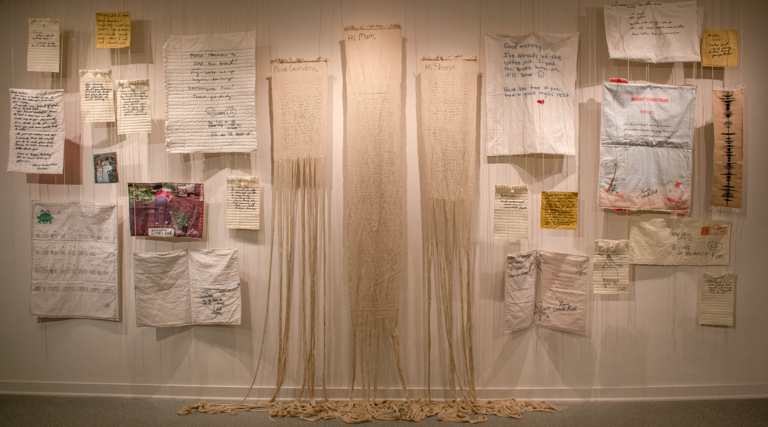 Letters of Love celebrates human connection and the beauty found within ordinary moments of life through the lens of notes, photographs, and voicemails. The quilted pieces represent those who have shaped my life and the woven works are a vessel to write to those who have passed. Photo by Becca Stickler.