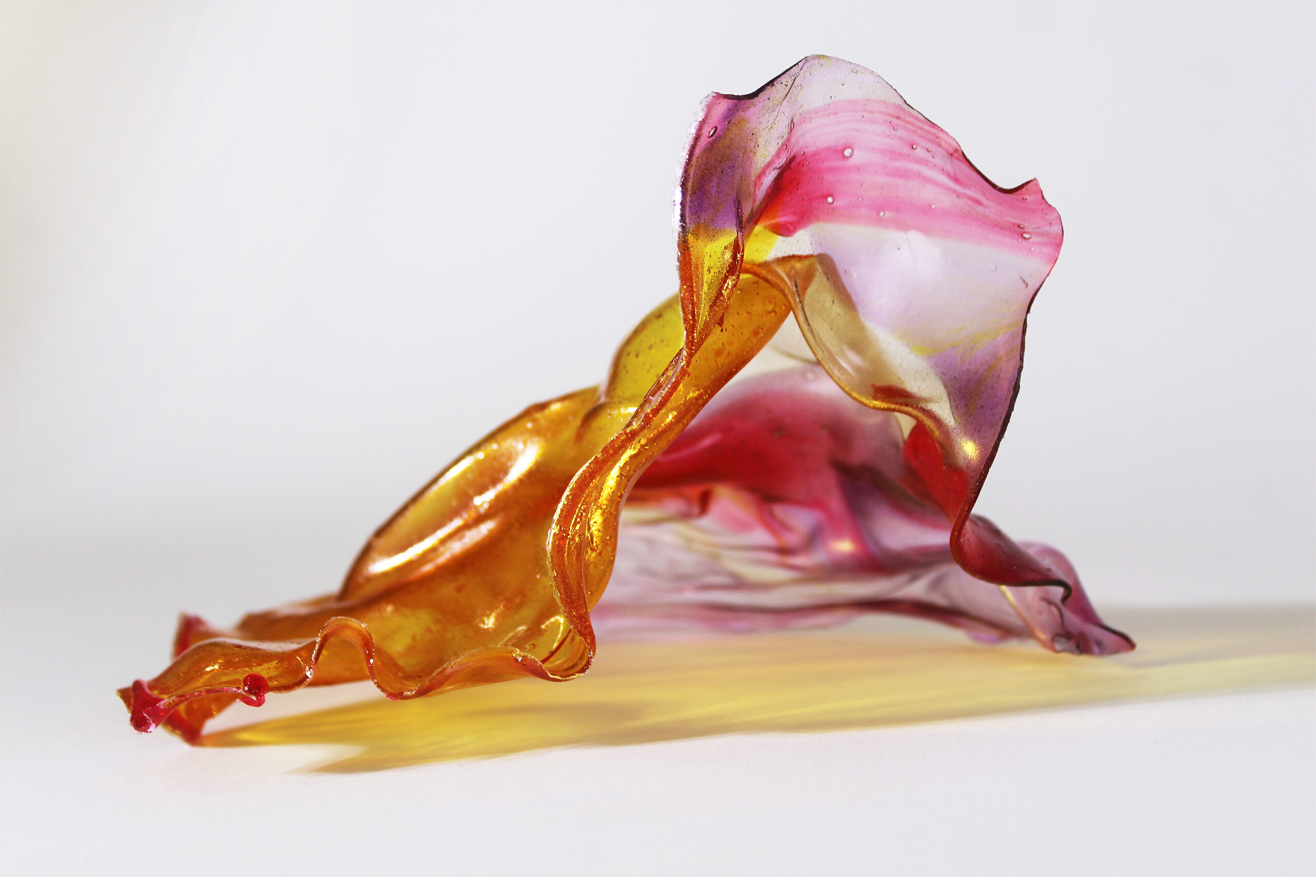 Developed specialized material inspired by auras, embodying malleability, transparency, lightness, and color conveyance via Bio-Plastic, capturing the unpredictability, through color, light, and dynamic energy interplay. Photo by: Andrea Loyer Makhlouf.