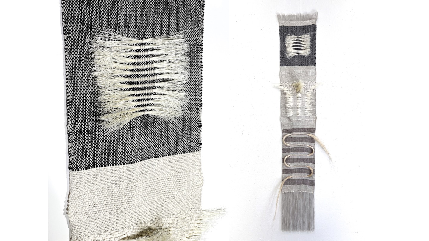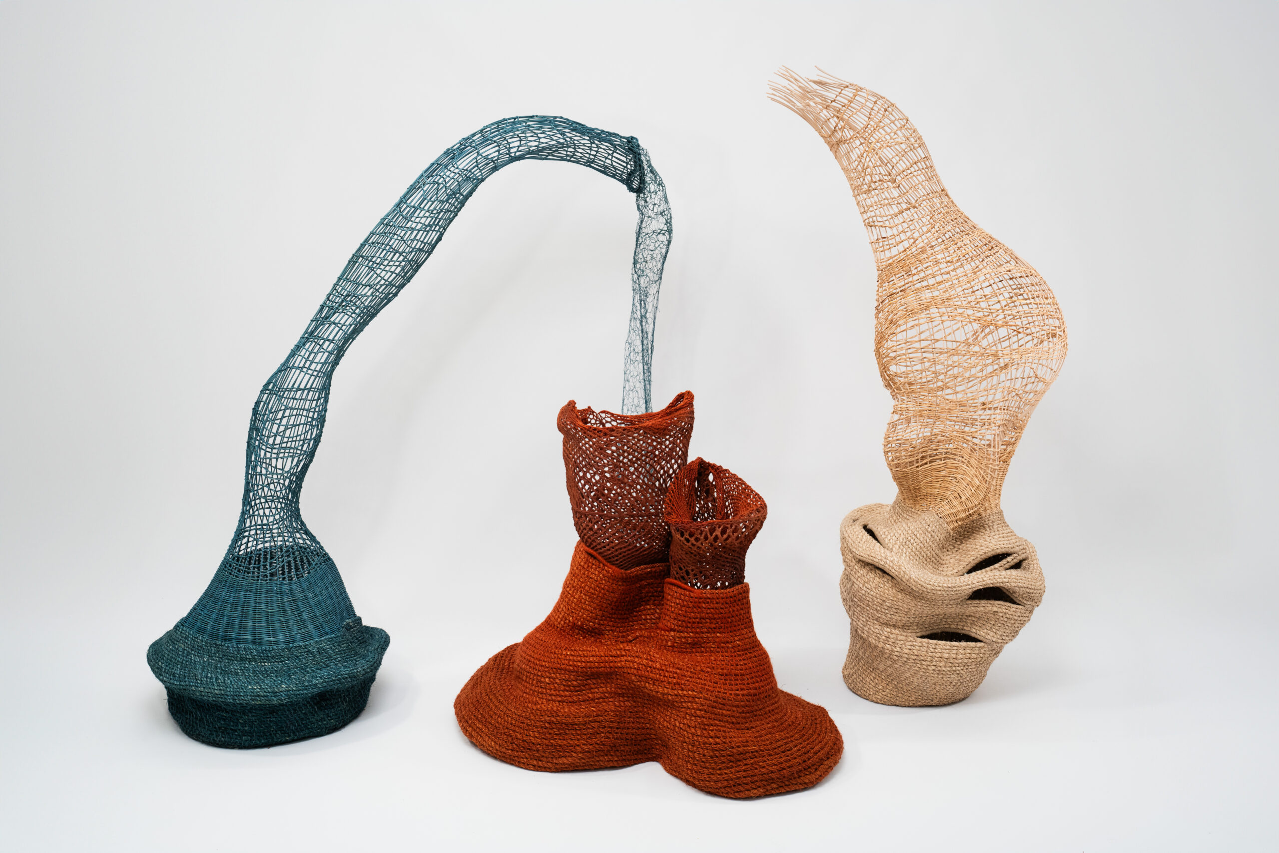 Gentle Structures explores the link between physical and psychological environments, employing weaving, basketry, sprang, natural dyes, and coiling. Inspired by architectural history, sculptures symbolize growth and time passage, reflecting inner landscapes through contrasting shapes and materials. Photo by Jason Greenberg.