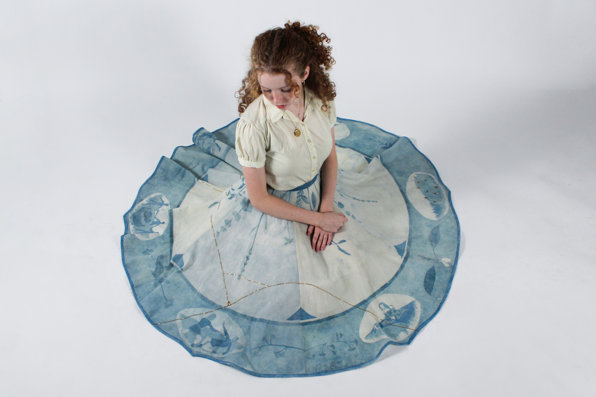 This piece tells the story of the Celtic goddess of healing, Airmed. Her story highlights her selfless ability to channel her grief into helping others. The skirt mimics the form and color of traditional cobalt-painted china and includes beaded "cracks" like a broken plate repaired with Kintsugi.. Photo by Mary Mays & Bee Freeland.