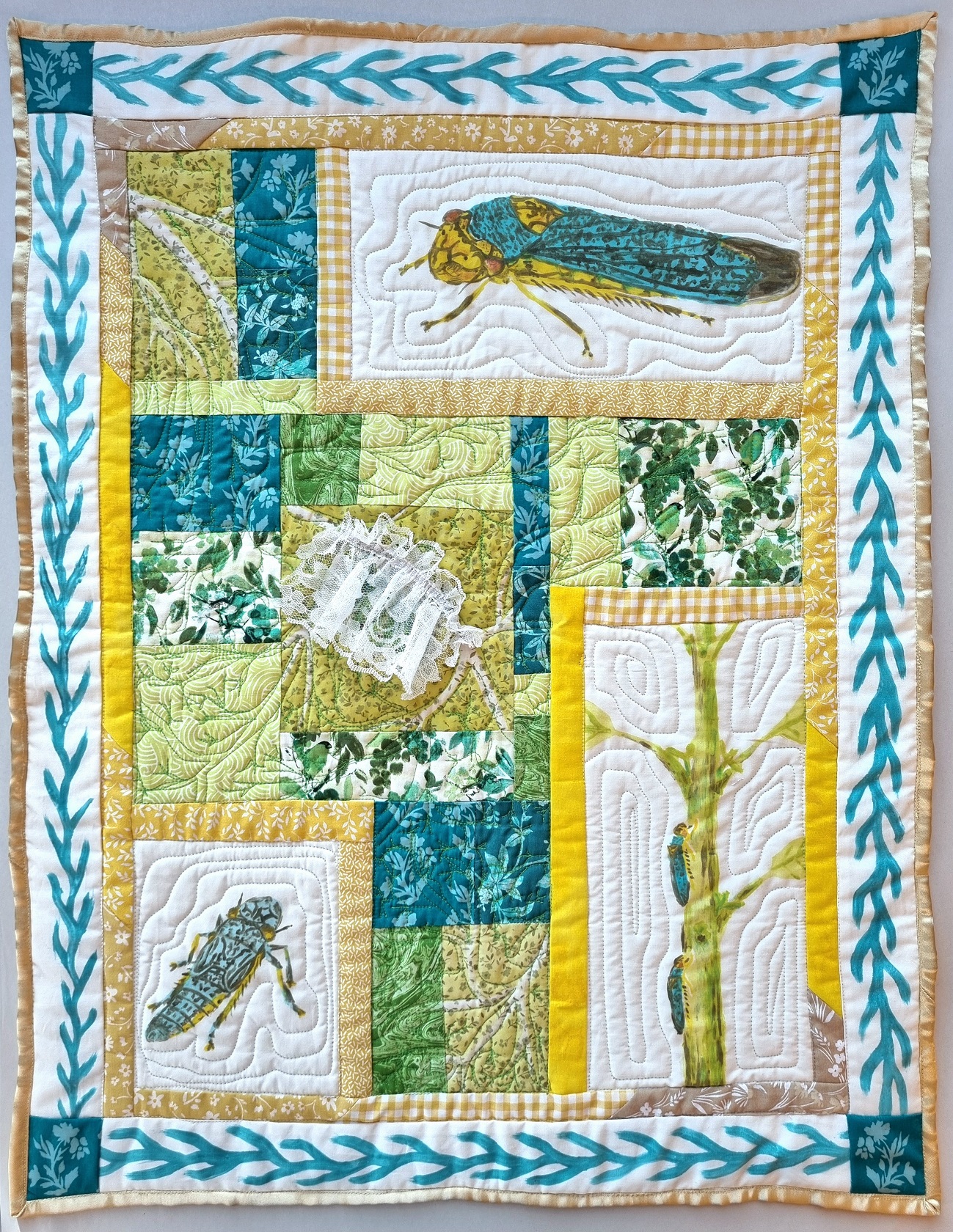 Some Cicadellidae leafhopper species create a special protective protein layer over where they lay their eggs. Depicted on this baby-blanket-sized quilt are the adult and nymph stages of one of these species, the Broad-headed Sharpshooter. Lifting the lace reveals its eggs. Photo by Lochlyn McClure.