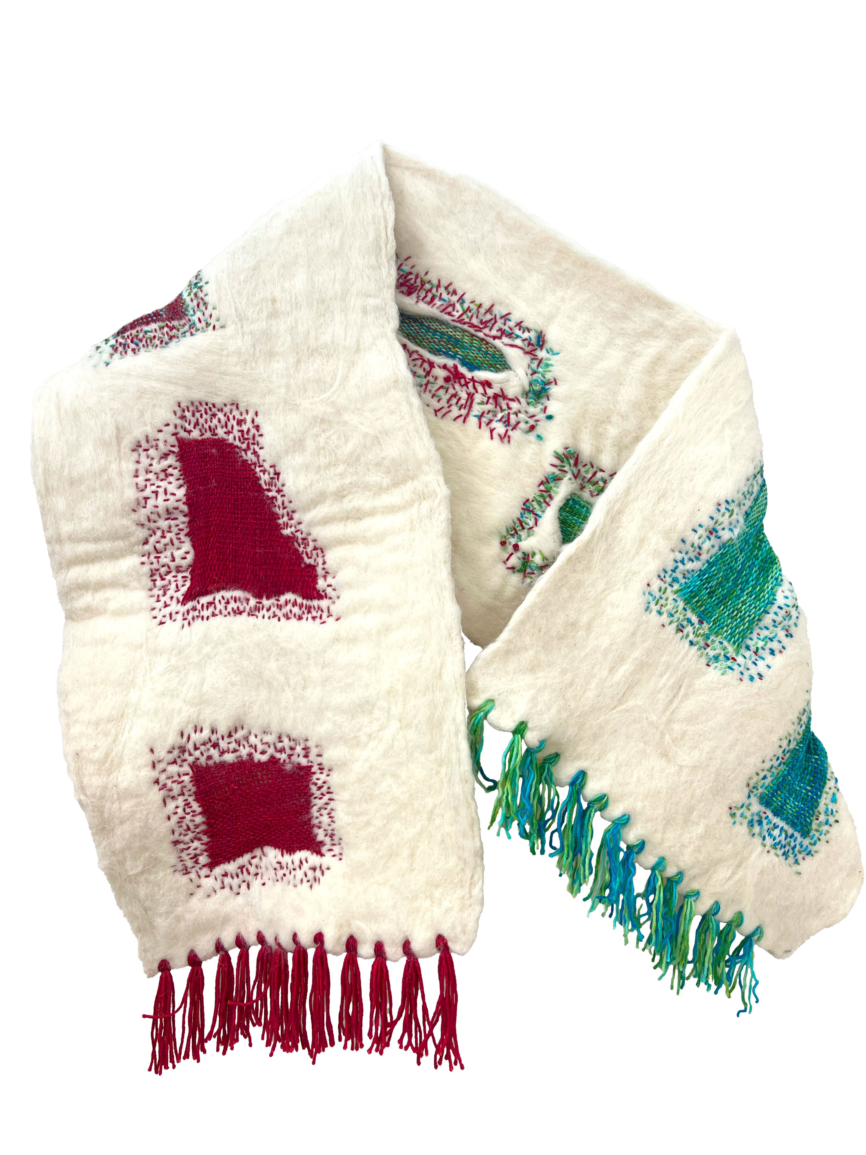 Transition is a shawl that was created from a series titled "Healing Journey". It is the visual representation of immense trauma represented through vivid red yarn darned over white merino wool. Blue and green transition in each weaving to show the slow emergence of hope and healing along the way. Photo by Becca Miller.
