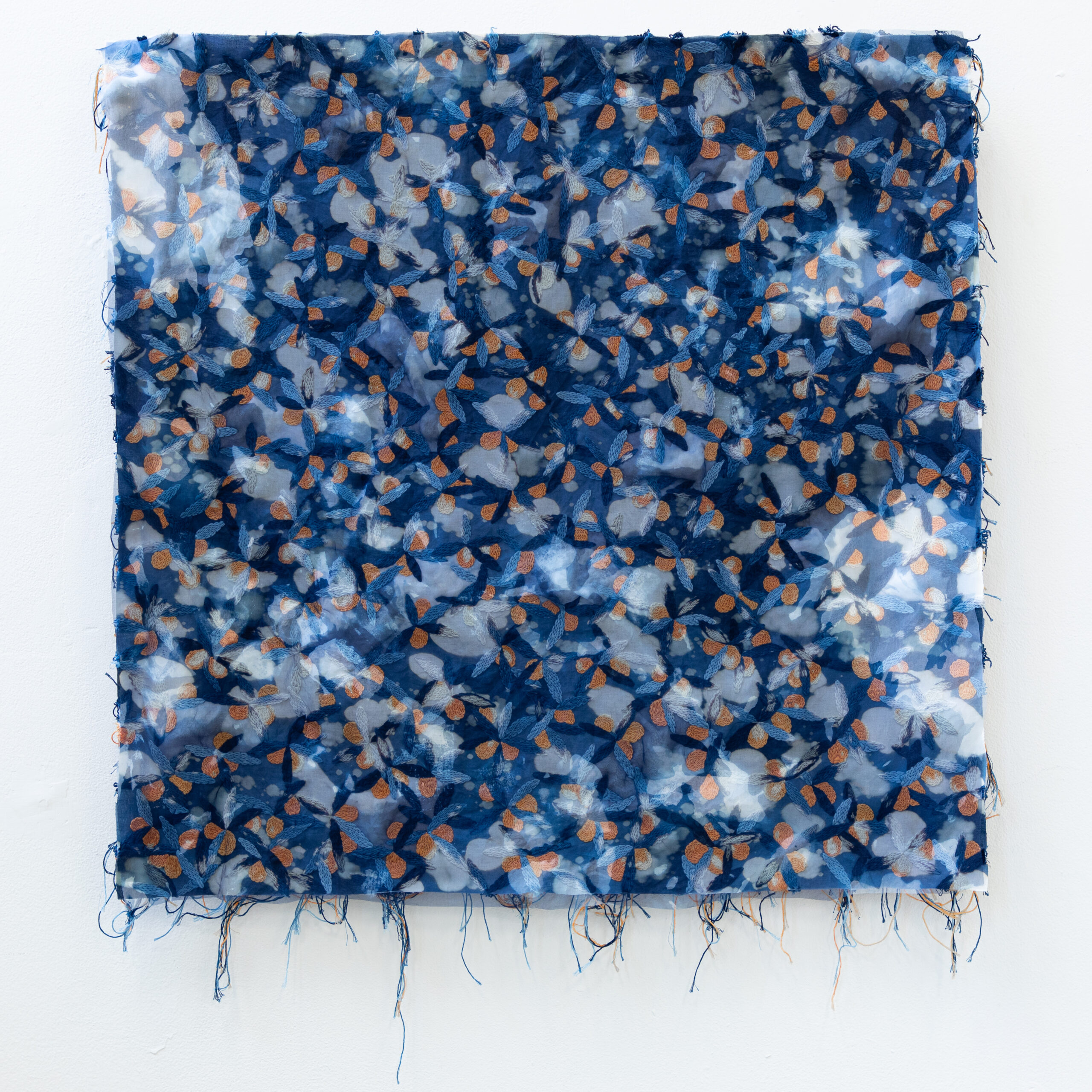 Hand-dyed cotton and silk, raw bamboo, silk, and cotton, bleach, mirror film, thread, hand-embroidery [36" x 36"].