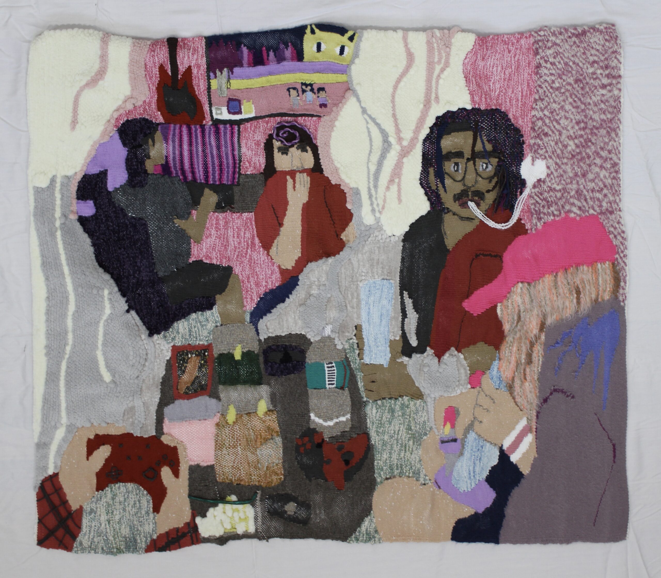 Looking at the smoke circle as a ritualistic gathering, this tapestry was woven on a floor loom from left to right to maximize the scale of the piece. Made from natural and synthetic yarns of various weights, this tapestry is a collage of textures, trinkets, and memories.