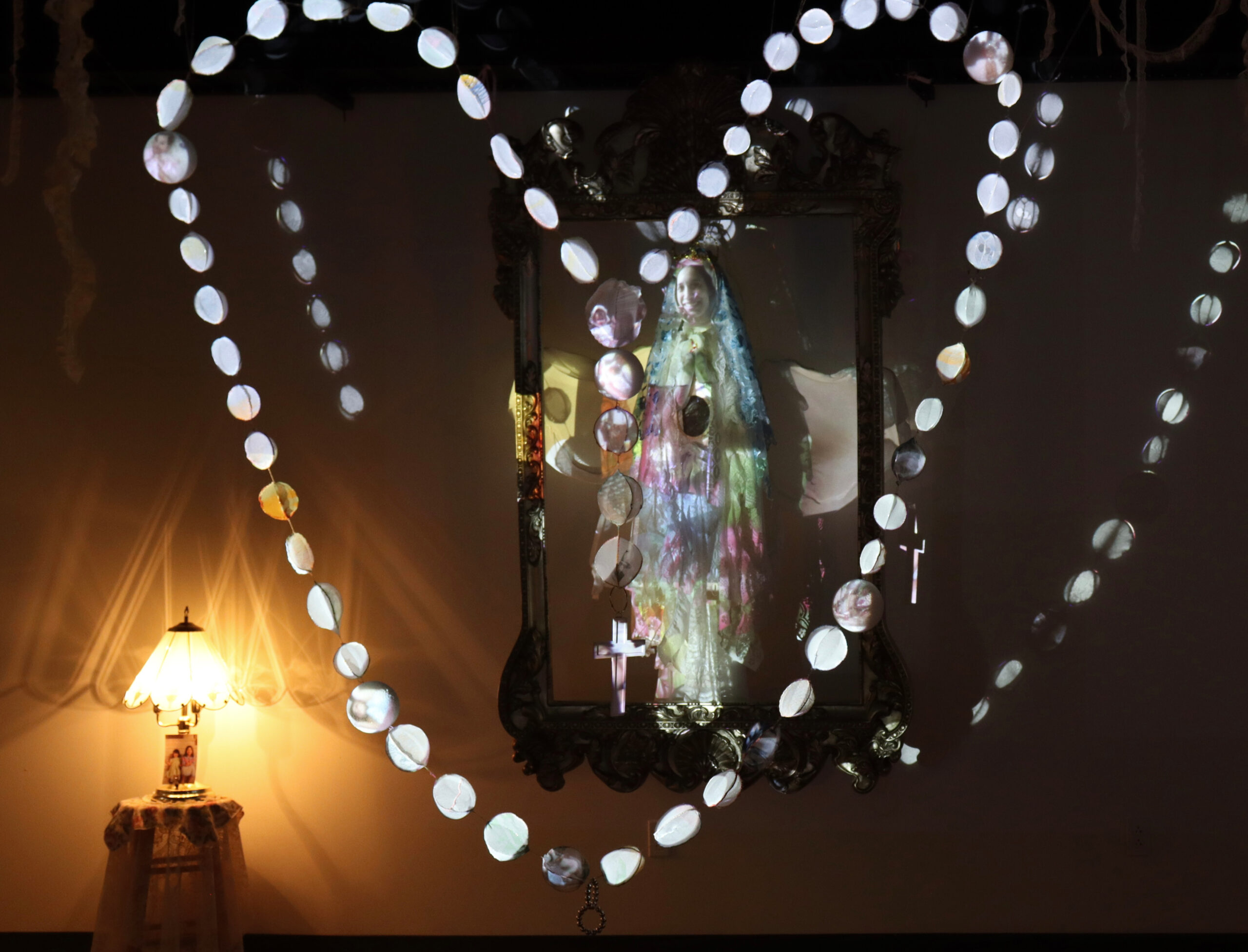 This was a shot of my final video art installation with three soft sculptures constructed over the course of the semester: a giant mesh orchid placed behind a plush of la Virgen del Valle, which is framed by a giant rosary. The beads are resewn fragments of screenprints depicting my mom/grandma. Photo by Sofia Ortega.