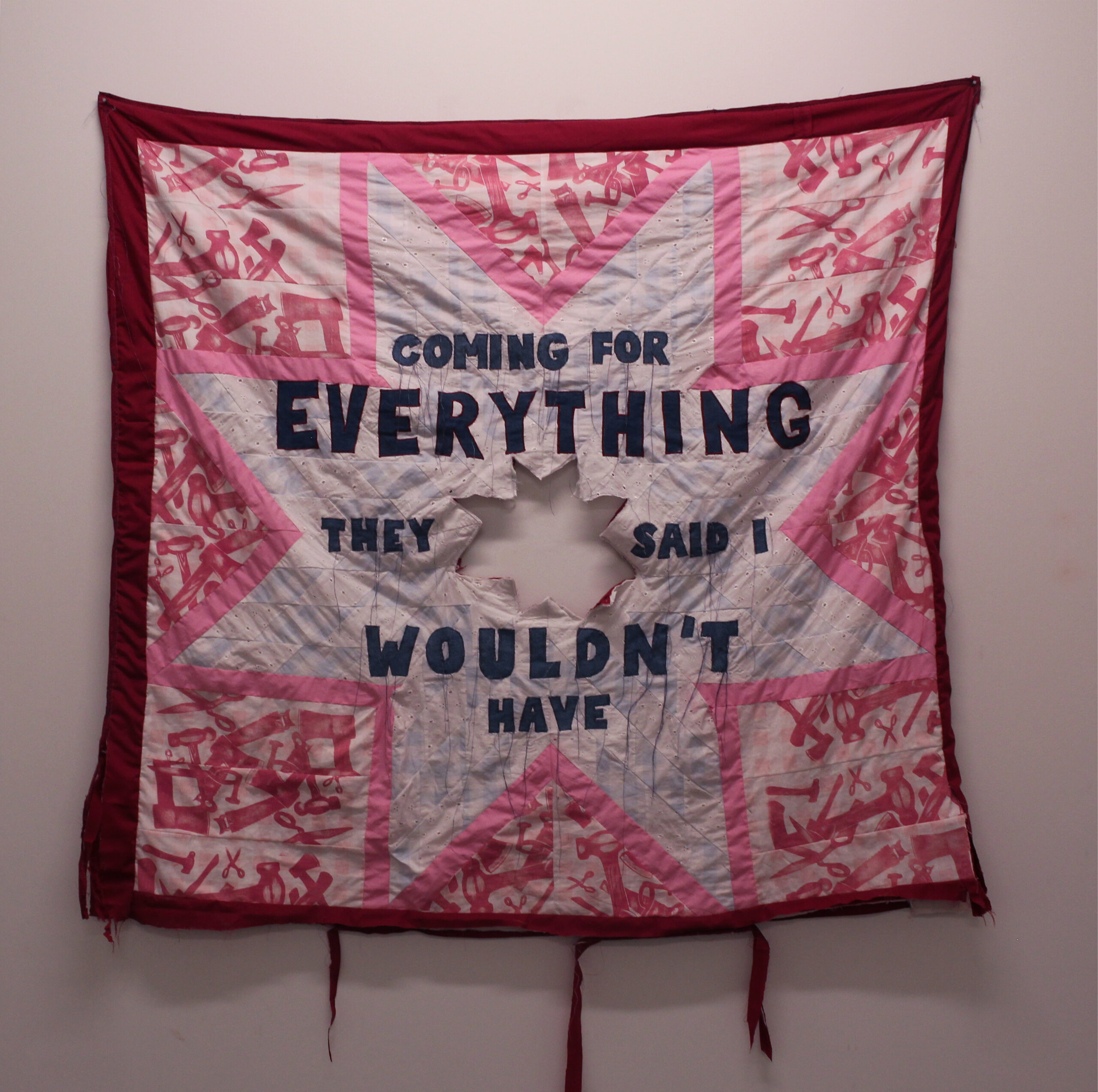 Coming for Everything is a quilt pieced together with denim, printed lithographs, and eyelet fabrics. Within this quilt, I explore themes of resiliency, survival, and the reclamation of life drawing from my own lived experience of being a woman with a chronic medical condition.