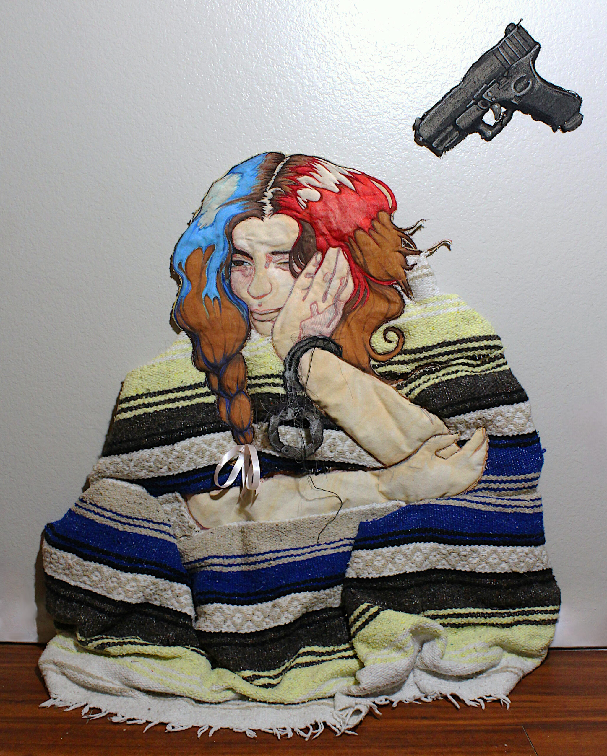 Canvas, batting, acrylic paint, poly-fil, thread, falsa blanket, ribbon, nails [48" x 36"]