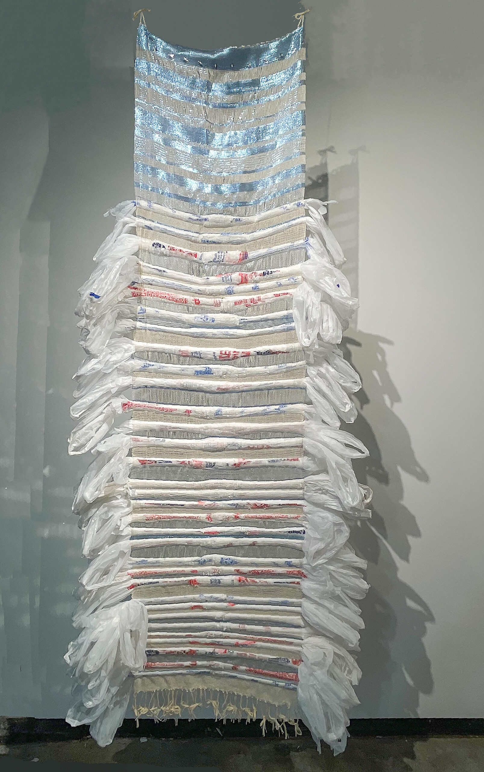 Stars and Stripes was created on a floor loom using woven grocery bags and metallic thread. The work was guided by a reflection on consumerism, textiles, and waste in America.
