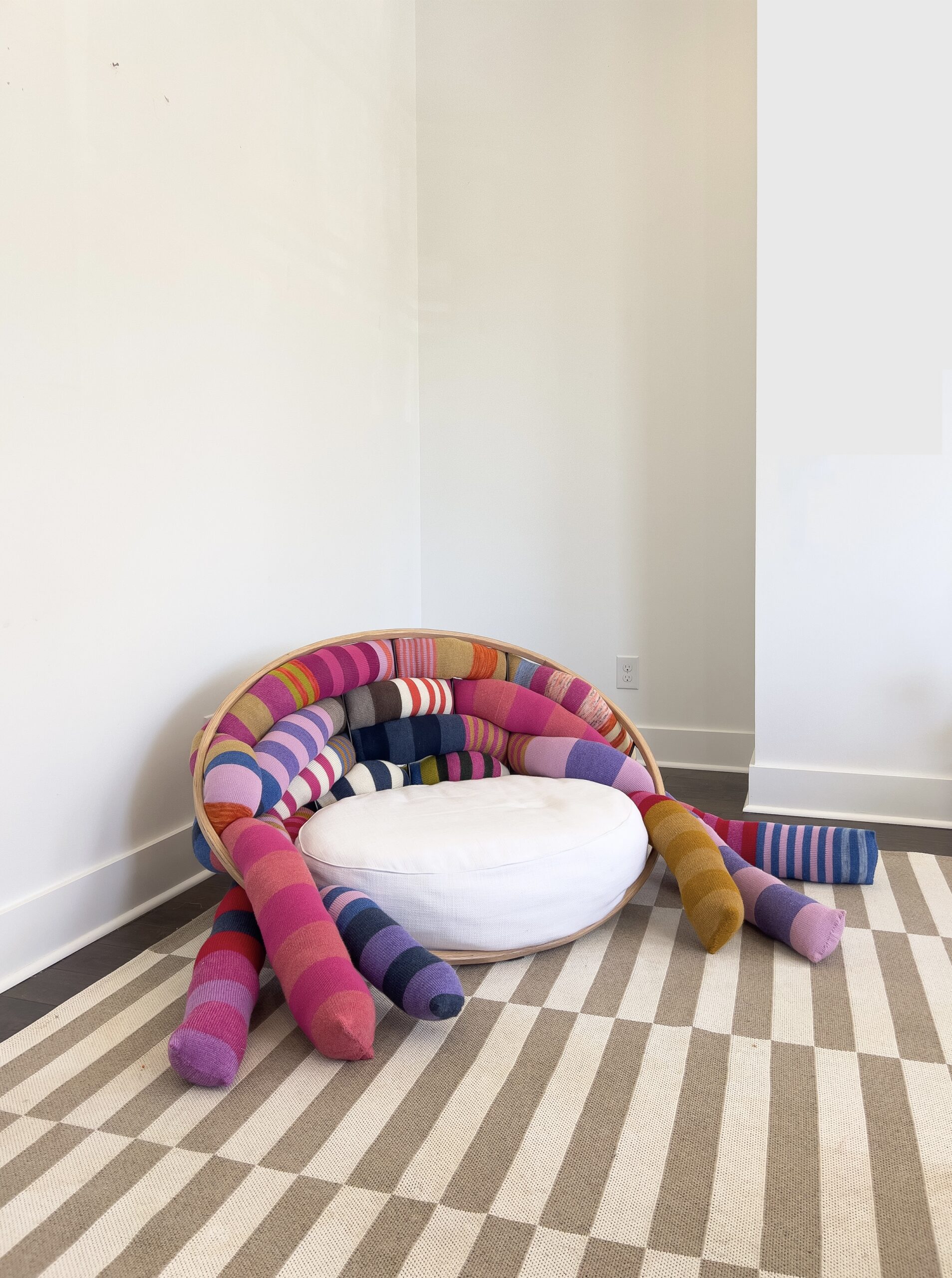 THE NOODLE CHAIR, is an interactive chair based upon the childrens book, ‘The Little Prince’. This colorful piece is designed to bring anyone who gets to experience its warm cuddles back to their youthful spirit through color and form. Collaboration with Furniture Designer, Daniela Fleischman. Photo by Ruby Wrigley.