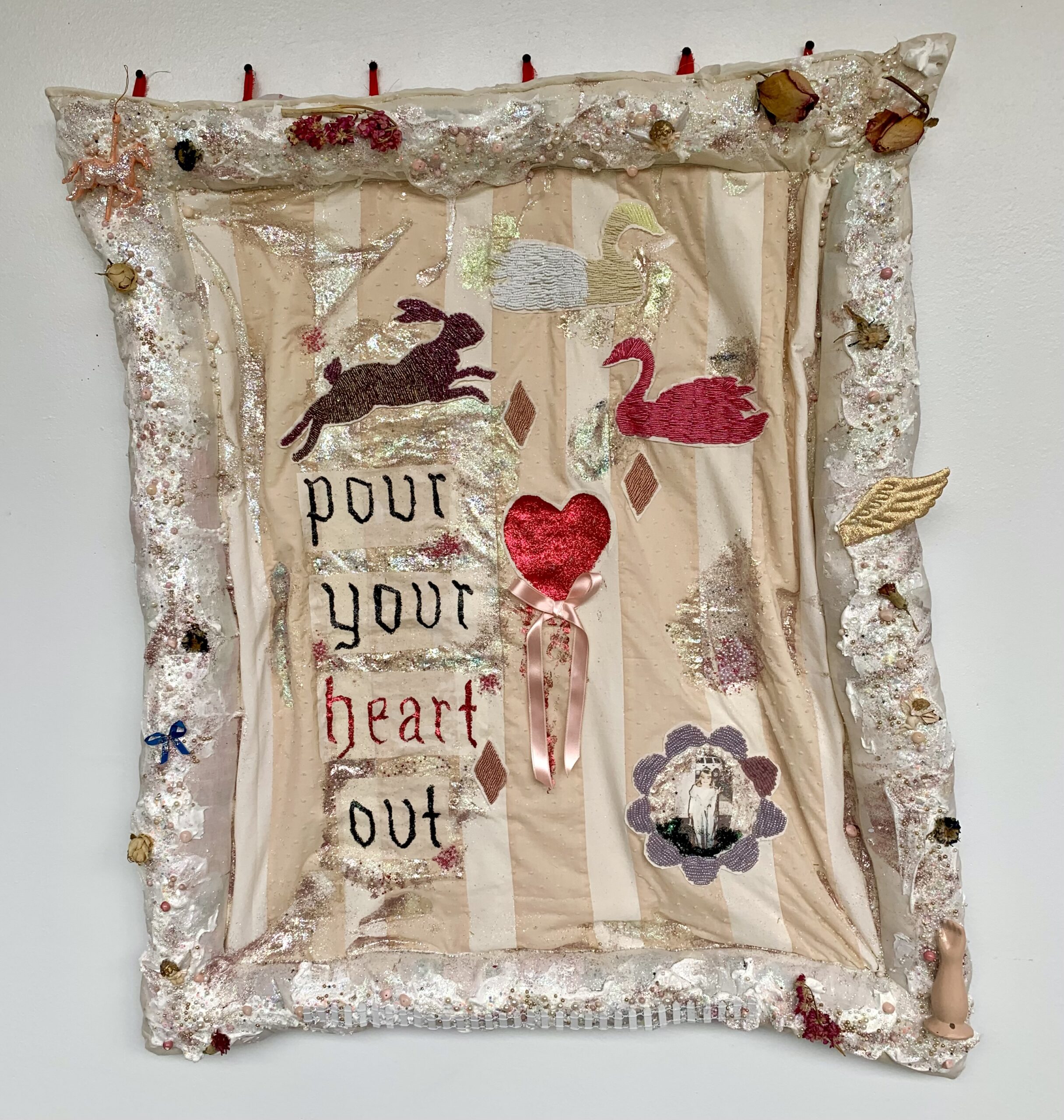 In Pour Your Heart Out, memory and care are represented through the use of secondhand materials and hand beaded animals. The frame is stuffed using scraps from completed and abandoned projects and covered in a mixture of glue and spackle to adhere layers of beads, glitter, and found objects.