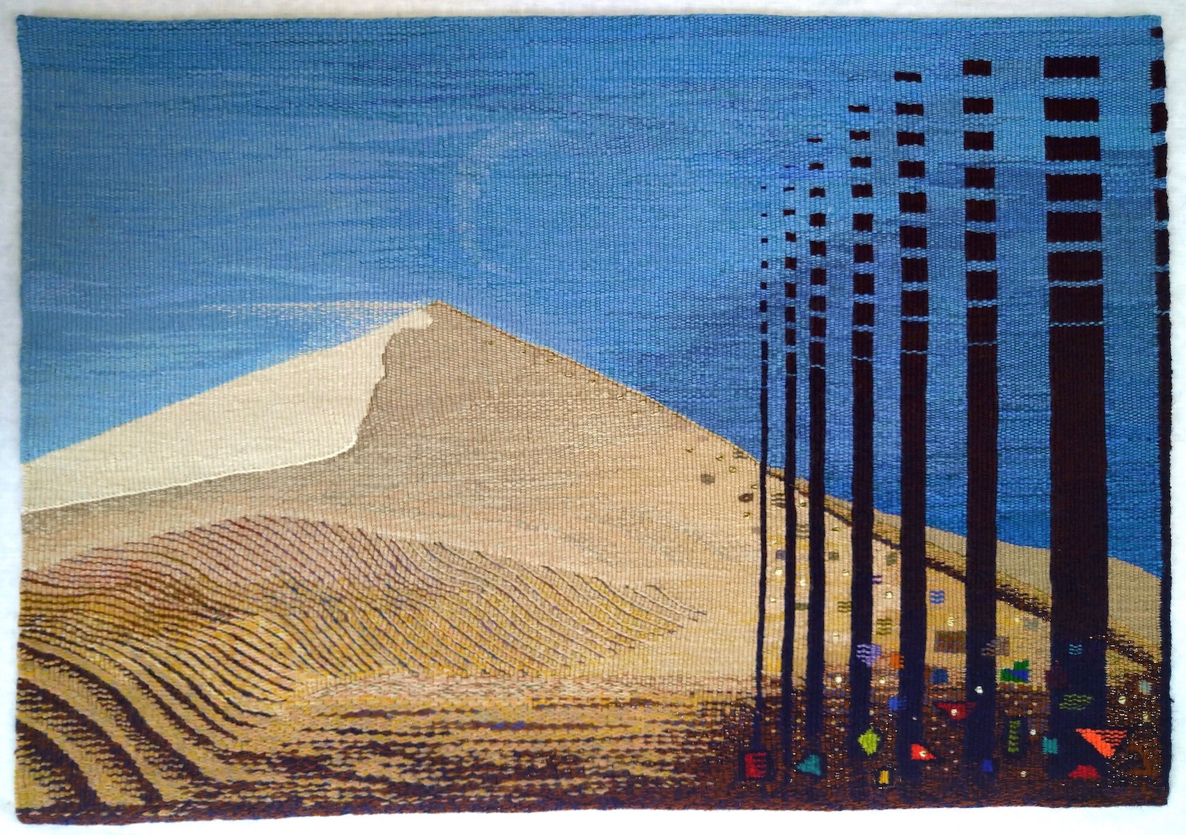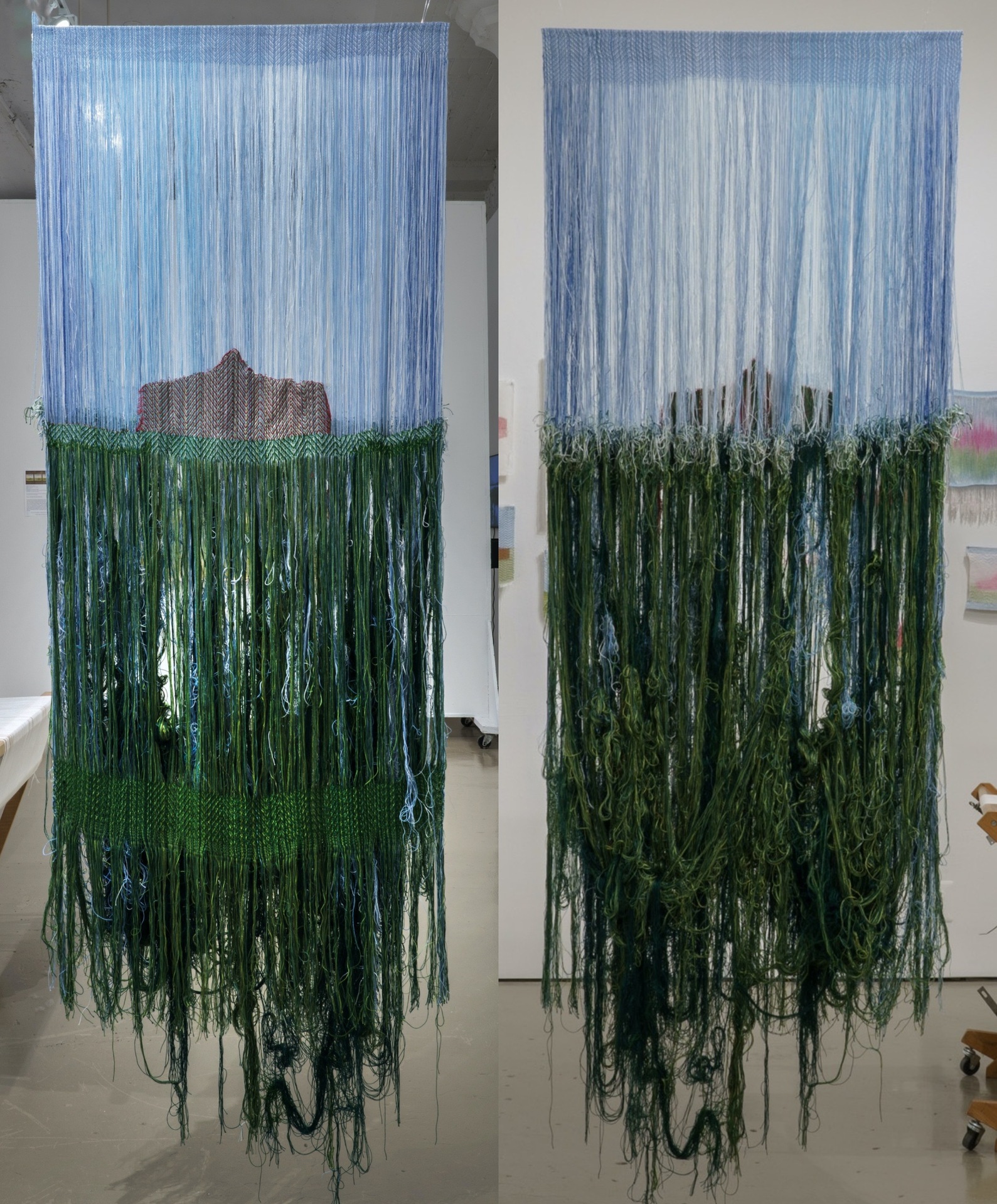 We are connected and Interwoven with the rich landscape and our past. The knots exposed remind us how made by one past warp thread connecting to the present warp thread. Using a supplementary warp with blues and green, deconstructing comes after to help create my memory of the family farm landscape.