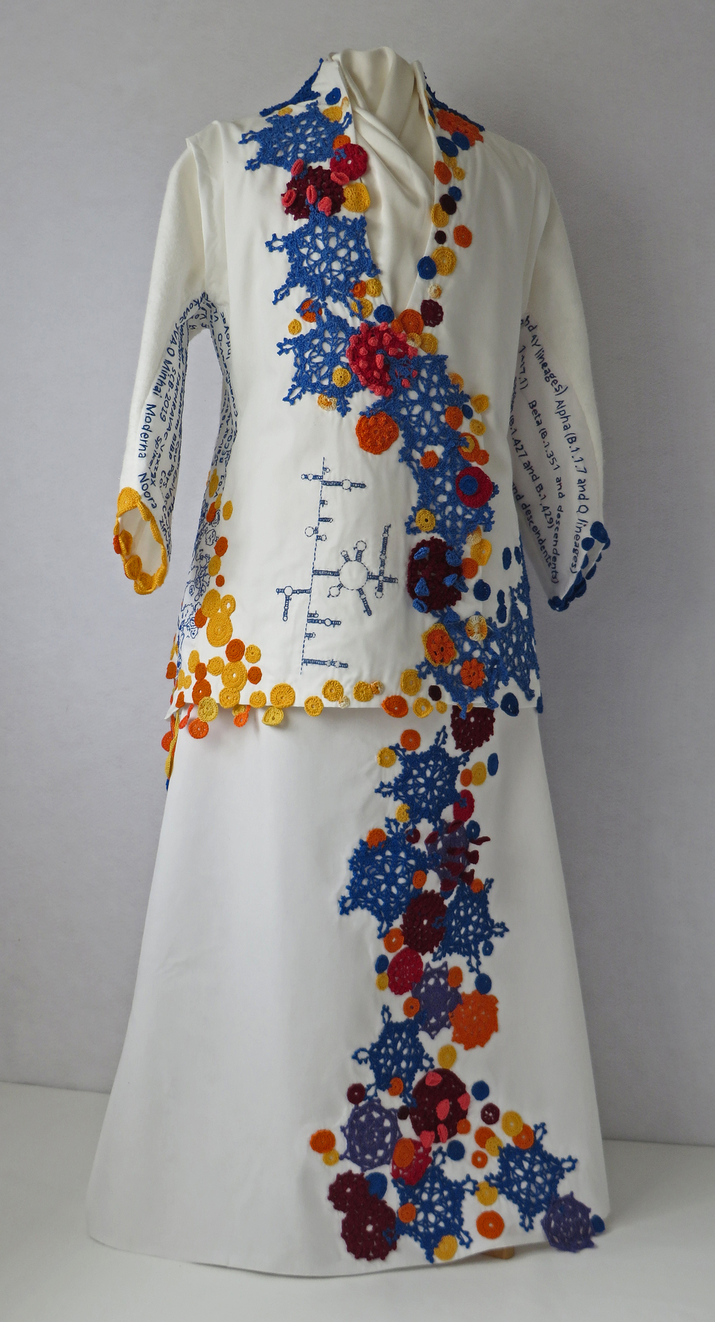 Jacket and Skirt with hand crochet interpretations of COVID cells, Hand embroidered molecular structure of COVID, high definition microscopic image of COVID cell, world map and underarm lists of names of vaccines researched and COVID variants. A world wrapped in COVID: 2019, 2020, 2021, 2022, 2023
