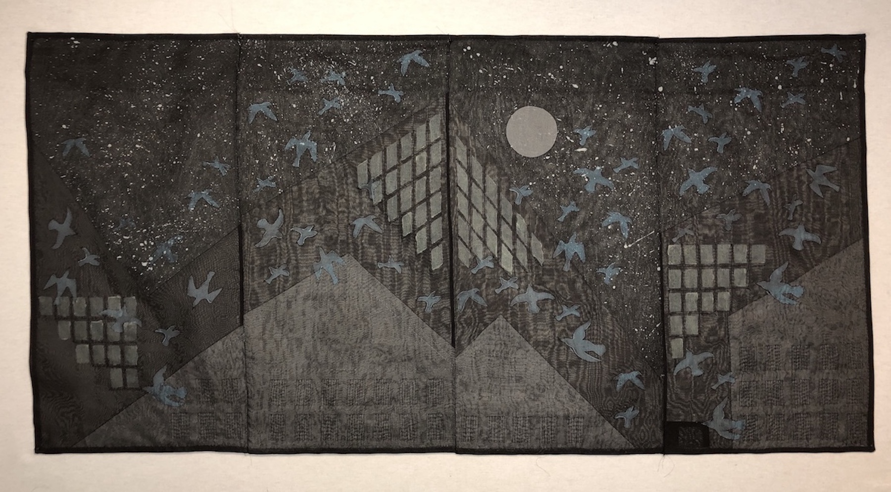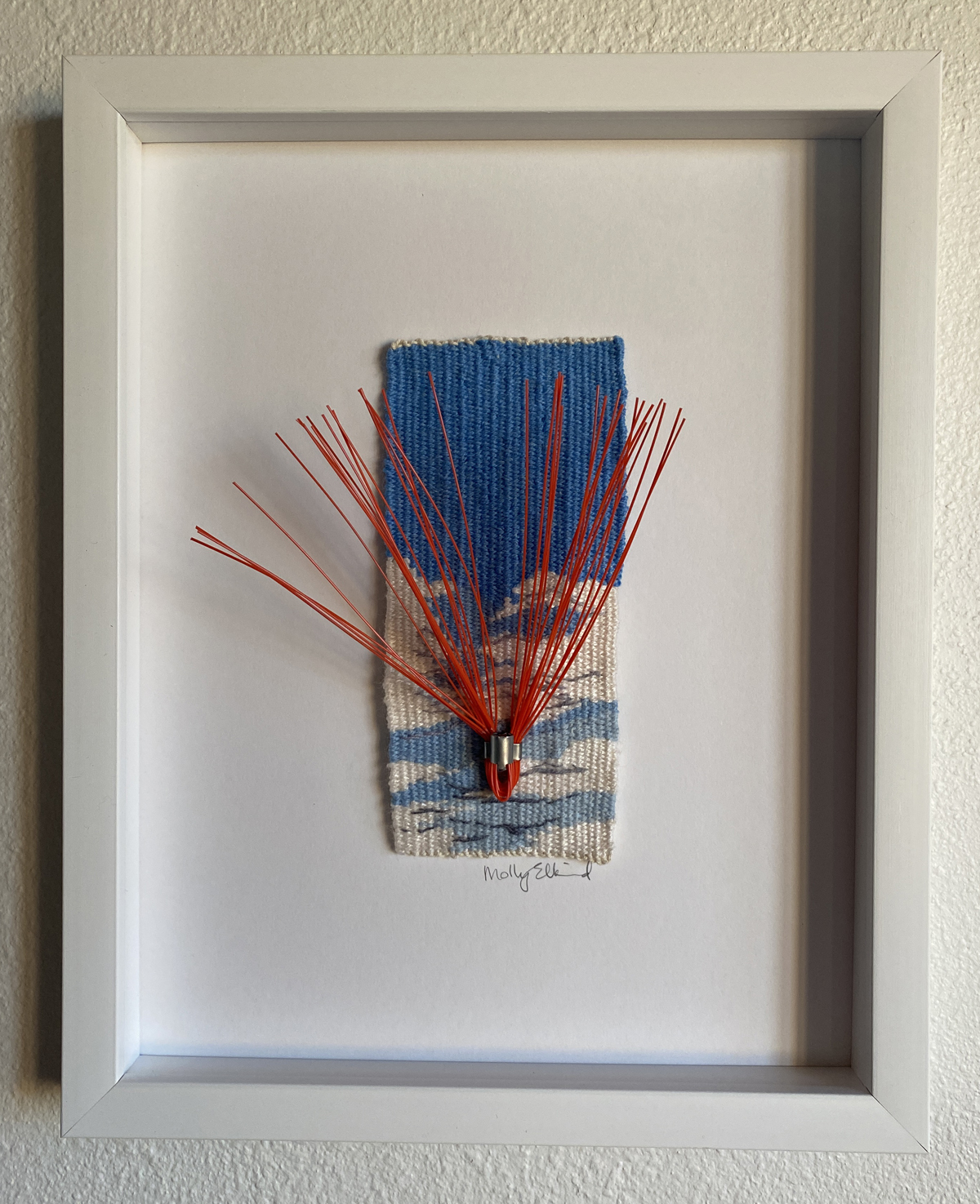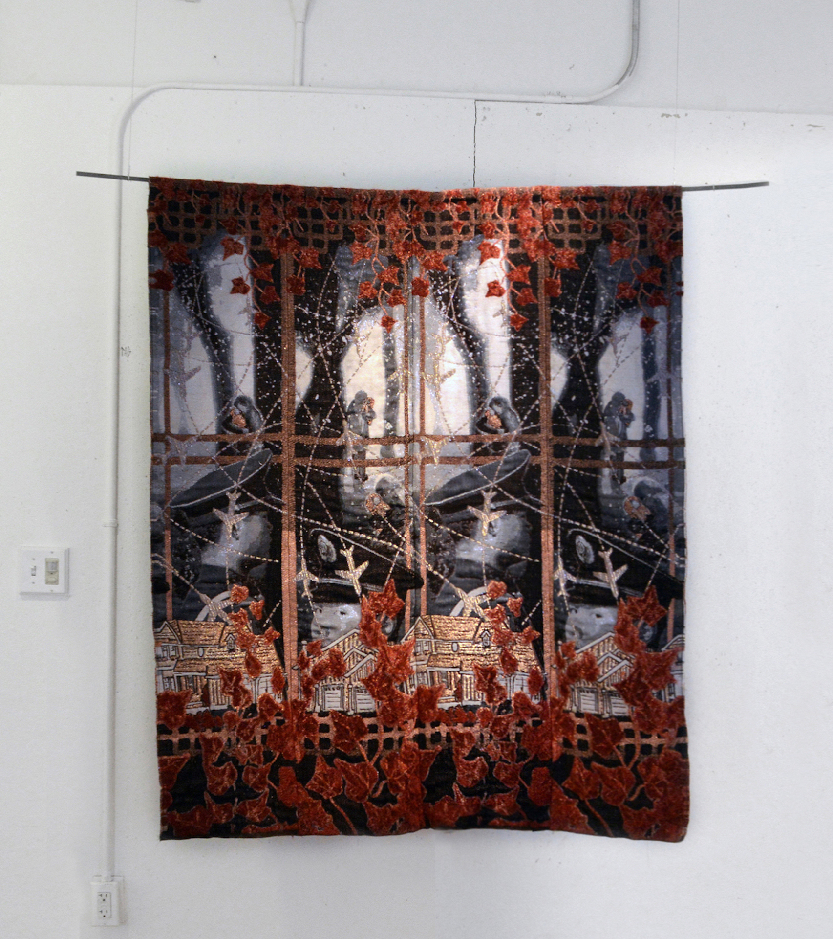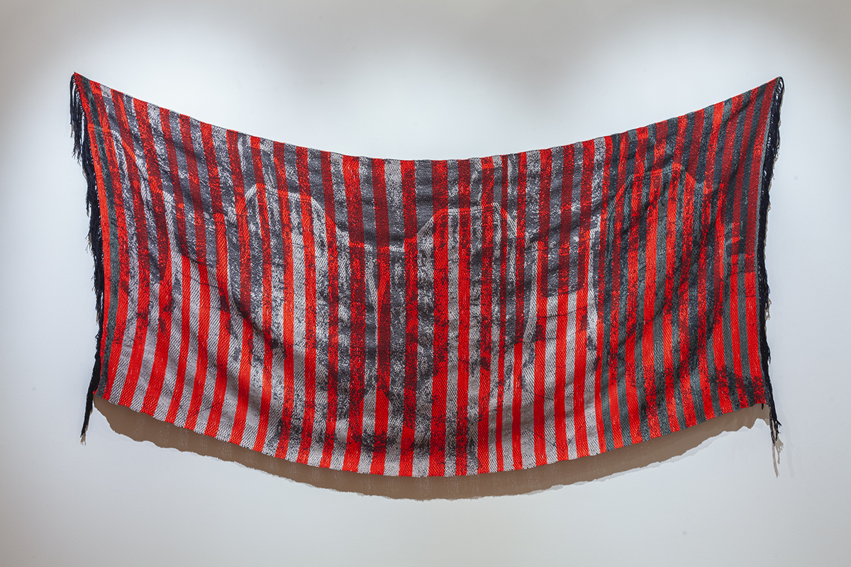 The COVID pandemic altered our sense of safe keeping. During this crisis, we were told to distance ourselves from others, love from afar, to fear others. “Shelter in Place,” woven in stark black, white and red, portrays our isolation; offering but a tiny window’s view from our separate silos.