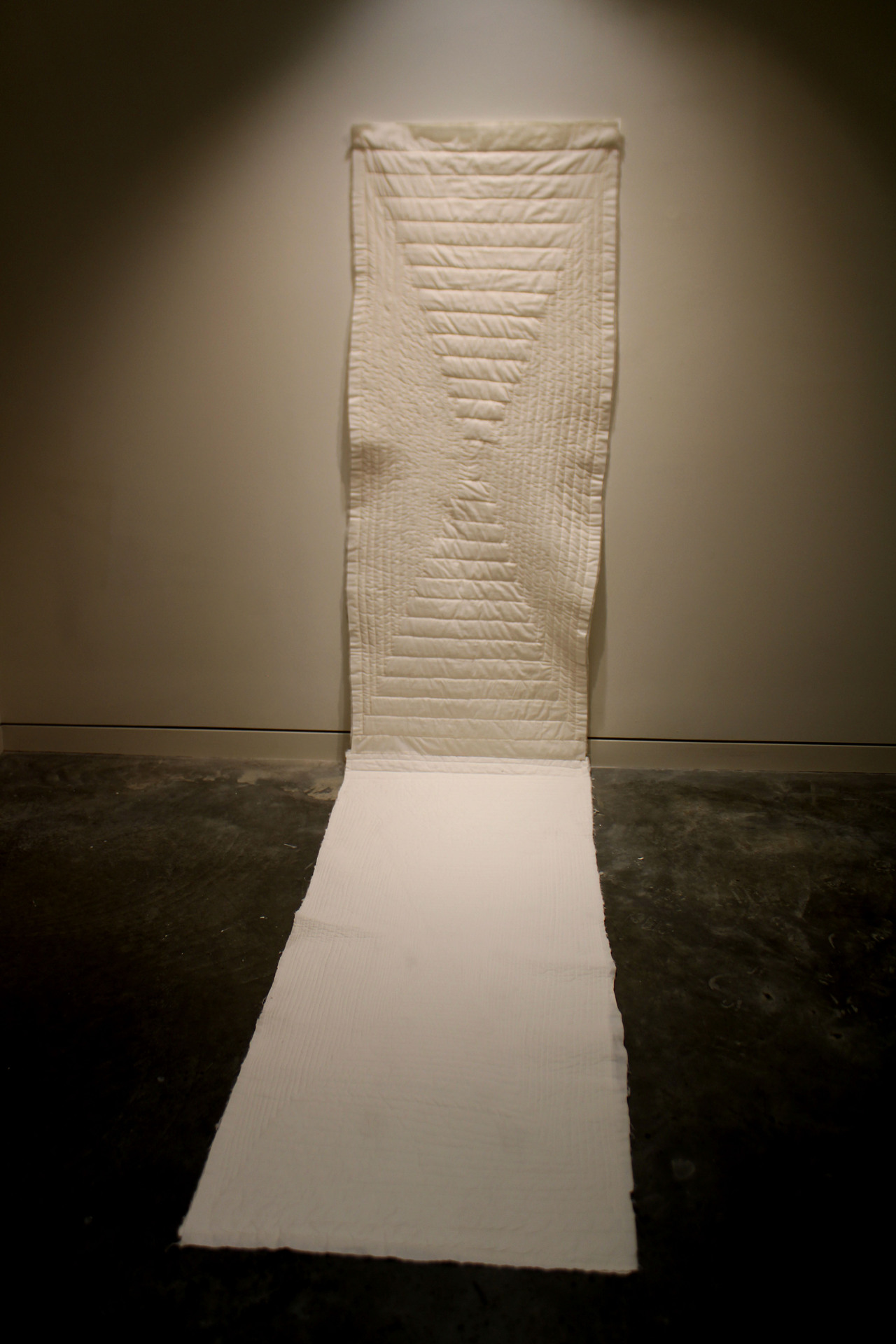 A quilt in the shape of a door using two variations (pieced and quilted and quilted whole-cloth) of a traditional quilting pattern named Courthouse Steps. The title is a reference to Franz Kafka's Before the Law. “... he perceives a radiance streaming immortally from the door of the Law."