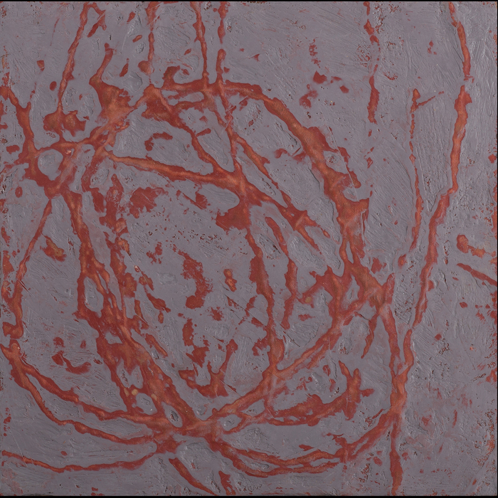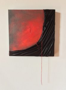 - Joan Pao “Red Study No. 1” 2016, Mixed media on cotton, 12” x 12” x 0”