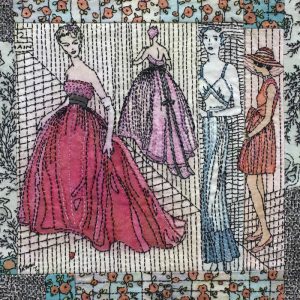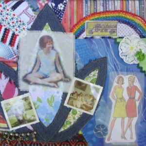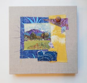 - Kirsteen Buchanan “Yesterday Once More: 70’s Summers” Mixed media collage: fabric, embroidery, applique, digital painting; 12” x 12” x 1.5”.