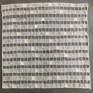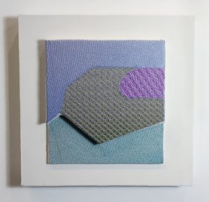- Kate Barber “Four X Four” 2017, Polyester, linen, wool, cotton; 11” x 11” x 1”. Website: www.katebarbertextiles.com
