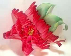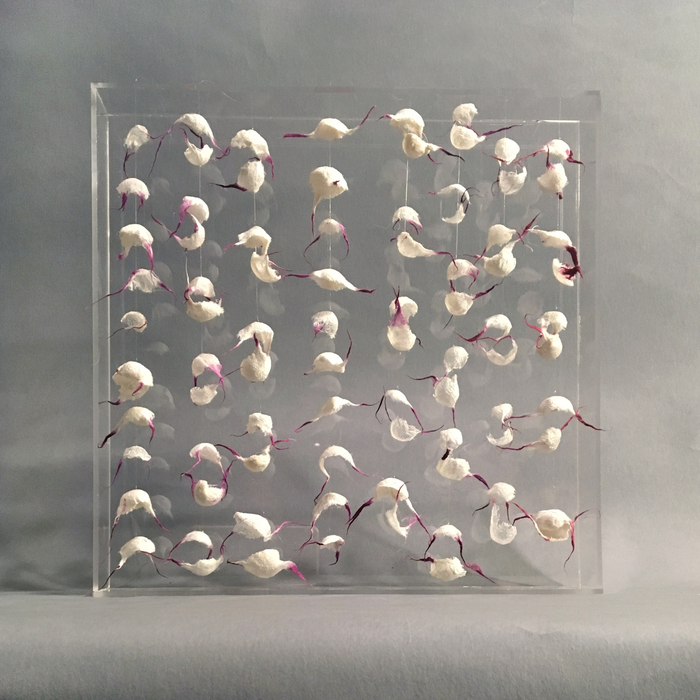 - Yoshiko Wada “Two Lives, Many Lives” 2017, Silk manipulation, dyed in cochineal; 12” x 12” x 1.5”. Website: www.yoshikowada.com