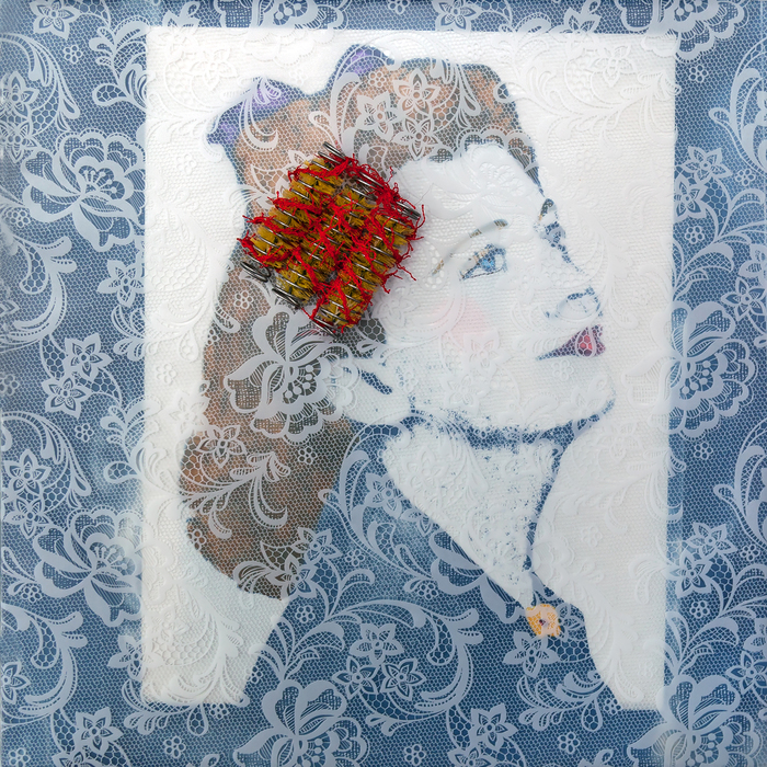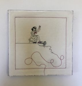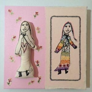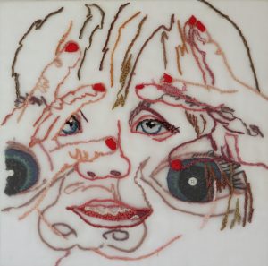 - Susan Weissman “She’s So Me” 2017, Hand embroidery/mixed media, 12” x 12” x 1.5”.