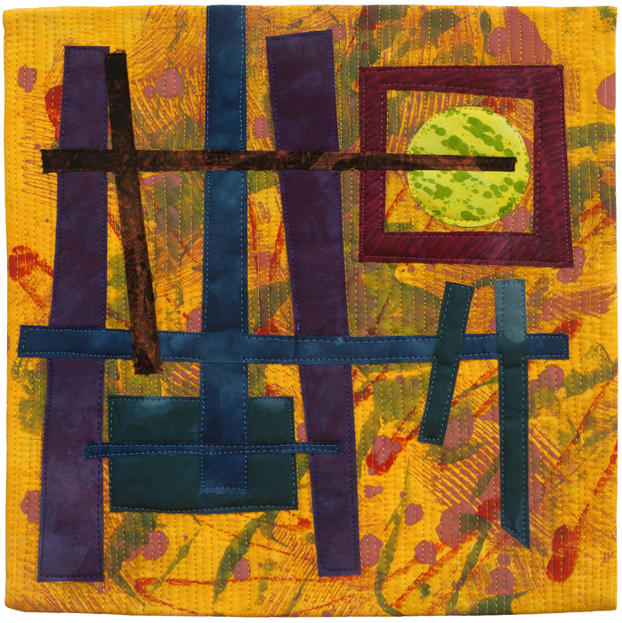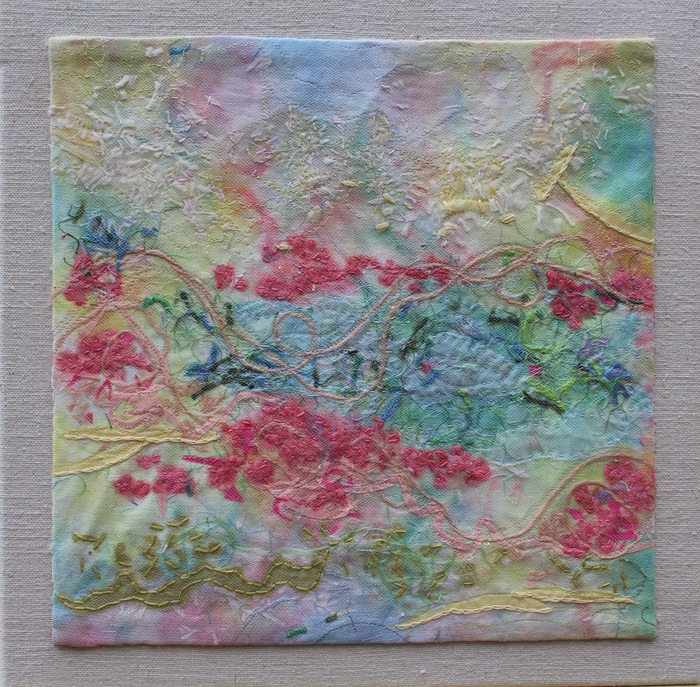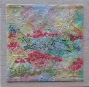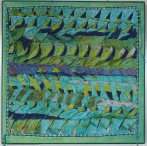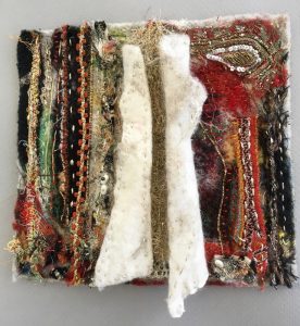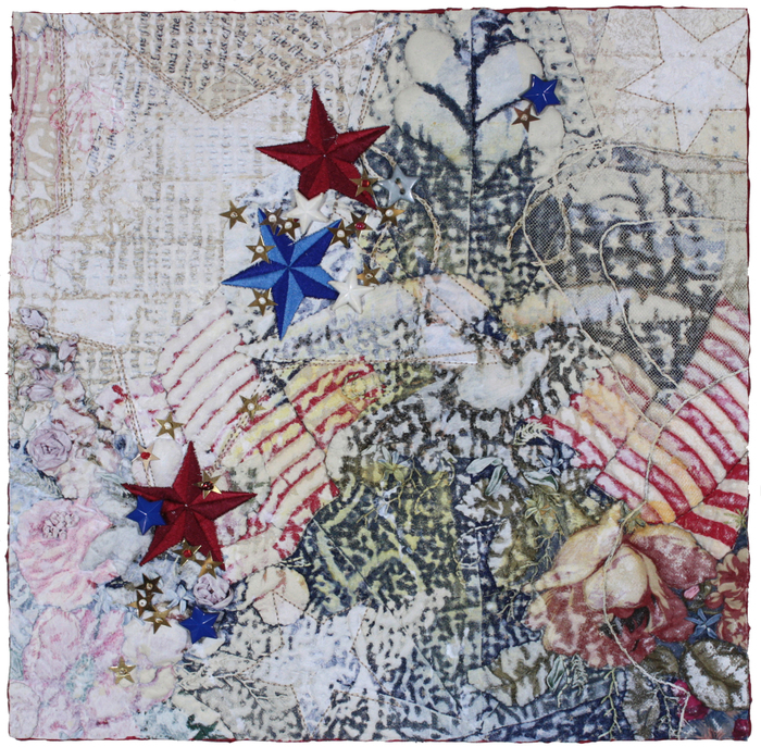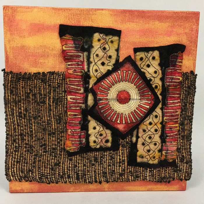 - Cheryl Miller “Spring Awakening” 2017, Fabric collage, 12” x 12” x 1.5”. Website: www.cherylzmillerart.com