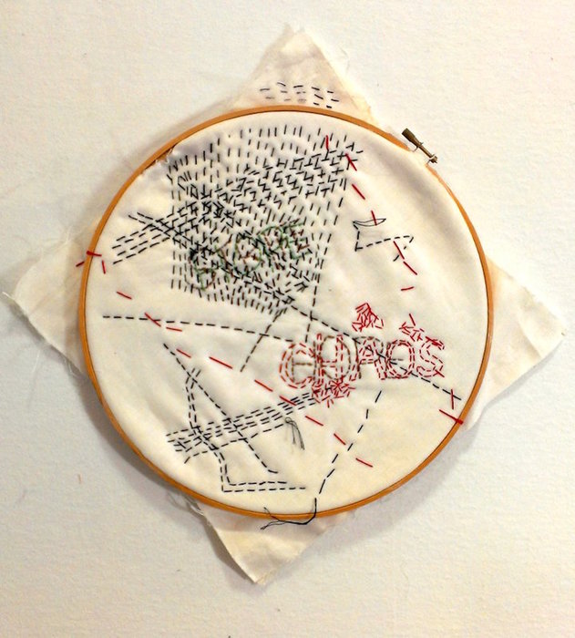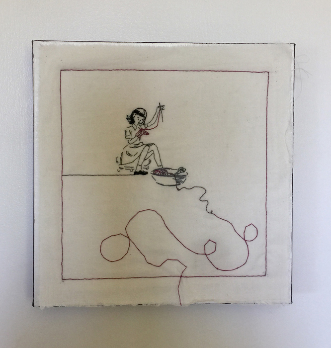 - Roz Ritter “Circa. 1949 #5” 2017, Hand embroidery, 12” x 12” x 1.5”. Website: www.rozritter.com