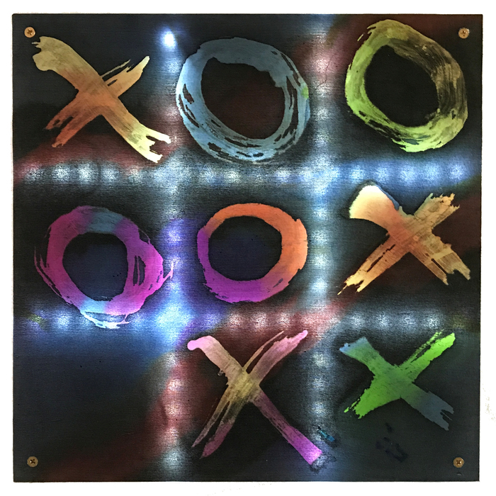 - Barbara Matthews “HugOrKiss?” 2017, Dyed silk applied to acrylic glass and lit with LED lights, 12” x 12” x 0”.