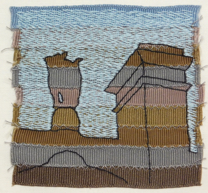 - Anne Nickolson “Rooftop” 2016, Embroidery on pieced, grosgrain ribbon; 3.5” x 3.5” x 0”. Website: annemckenzienickolson.com