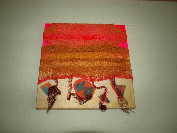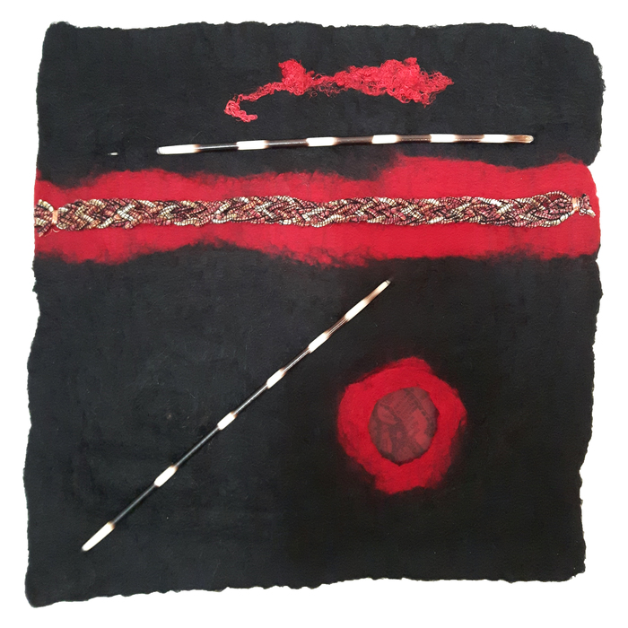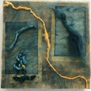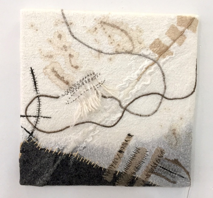 - Marilyn Casto “At Loose Ends” 2017, Felt, lutradur, yarn, wool, silk, hemp string; 12” x 12” x 1.5”
